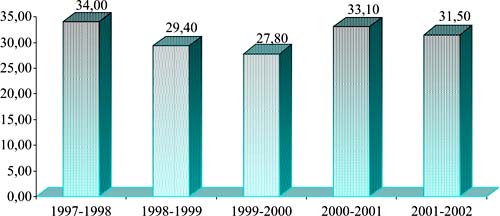 Рыбачук Ключевые слова: студенты, уровни здоровья, стиль жизни, педагого-акмеологические технологии. Анализ медицинского освидетельствования студентов-первокурсников, поступающих в Кубанский госуниверситет в период 1997-2002 гг. (рис. 1), позволил выделить процент студентов, имеющих отклонения в состоянии здоровья, и профили заболеваний. В создавшейся ситуации необходимы новые педагого-акмеологические технологии, позволяющие целенаправленно воздействовать на формирование здорового стиля жизни студента. Оптимизация учебного процесса по физическому воспитанию в вузах нефизкультурного профиля осуществляется посредством использования информационных технологий, позволяющих обучать предмету [5], планировать и контролировать физическую подготовленность, общую двигательную активность [6], психофизическое состояние [9], разрабатывать программы для оздоровительной физической культуры [10], проектировать модели здоровья человека. В теории физического воспитания физическое состояние рассматриваются на трех уровнях: - соматическое здоровье; - физическое развитие; - двигательная функция, уровень развития физических качеств. В нашем вузе физическое состояние студента соответственно представлено экспресс-оценкой уровня физического здоровья [2] и экспресс-оценкой уровня физической подготовленности [11]. Диагностико-рекомендательная, управляющая, оздоровительная студенческие программы базируются на представлениях о живом организме как о биологической системе, находящейся в состоянии термодинамического неравновесия [3]. "В состоянии устойчивого неравновесия биосистема может находиться до тех пор, пока она способна извлекать свободную энергию химических соединений и превращать ее в полезную работу" [8]. Существует прямая корреляционная связь между анаэробной и аэробной способностями, где аэробное энергообразование преобладает в сумме энергопотенциала [1]. Наиболее информативный показатель производительности кардиореспираторной системы - величина максимального потребления кислорода [1, 2]. Ключом к устойчивости организма к вариабельным условиям внешней среды может являться аэробный энергопотенциал, и его снижение часто приводит к хроническим соматическим заболеваниям. Именно поэтому воспитание выносливости в физкультурно -оздоровительном пространстве нашего вуза выдвигается на приоритетную позицию. Выносливость - способность организма сохранять устойчивый уровень работоспособности, несмотря на утомление, независимо от характера работы [7].