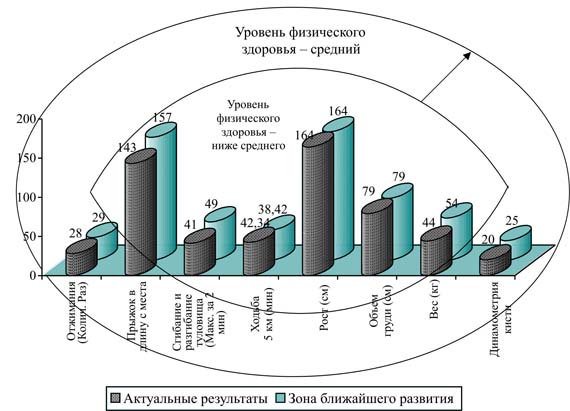 Рис. 2. Проектирование индивидуальной модели физического состояния студента Анализ кардиофункциональных показателей мужчин, занимающихся рекреационным спортивным тренингом с преобладанием работы на выносливость, показал, что для достижения физиологических эффектов, необходимых для профилактики болезней, достаточен тренинг небольшой продолжительности и интенсивности [12]. Рекомендации Всемирной Организации Здравоохранения (ВОЗ) по активной профилактике неинфекционных заболеваний также сводятся к "использованию нагрузок именно умеренной интенсивности и продолжительности" [4]. Для воспитания выносливости мы предлагаем аэробные упражнения, занимающие 50% учебного времени. В данном случае решаются задачи оздоровительной направленности. Укрепляя кардиореспираторную систему, мы обеспечиваем накопление энергопотенциала, повышая уровень физического здоровья. Наша задача - не вводить их физическое здоровье в преморбидное состояние, приближая к уровню "практически здоров". Мы отдаем 25% учебного времени профилактической физкультуре, совместно создавая модули профилактики социальных болезней, выступающие как превентивный набор-блок физических упражнений, направленных как на торможение механизмов патогенеза, так и на стимуляцию процессов саногенеза [13]. Упражнениям скоростно-силового и силового характера мы уделяем 25% учебного временим. Аэробный тренинг у нас представлен 8-недельным тренировочным циклом под контролем пульсового мониторинга: 1-2-я недели - 120 - 130 уд/мин 3-4-я недели - 130 - 140 уд/мин 5-6-я недели - 140 - 150 уд/мин 7-8-я недели - 150 - 160 уд/мин. Одновременно осуществляем педагогический контроль за психофизическим состоянием студента (диагностические карты, включающие в себя дневник самосовершенствования: исследование внутренней картины здоровья методом самонаблюдения). В зависимости от способа, и времени выполнения тренинга мы предлагаем выделить следующие его этапы: I этап, I семестр (58 - 48 мин) - адаптационный, в основе - ходьба со скоростью 48-63 м/мин; II этап, II-III семестр (48 -38 мин) - сочетание быстрой ходьбы и медленного бега при преодолении дистанции; III этап, IV семестр (38 - 30 мин) - оптимально -адаптационный. Этап преодоления 5-километровой дистанции произвольным способом с ориентацией на "окно пульса" "Экспресс-оценки уровня физического здоровья" и субъективные ощущения студента. В рамках мотивированного цикла формирования здорового стиля жизни молодежи мы предлагаем этапы совместного моделирования "аэробной" тренировки: I. Моделирование собственной "аэробной кривой" (зависимость мониторинга пульса от времени преодоления дистанции). II. Составление "матрицы" аэробного тренинга, где фиксируются составляющие пятикилометровой дистанции и способы ее преодоления. III. Сопоставление модели "аэробной кривой" и "матрицы" аэробного тренинга. Ориентируясь на результаты "Экспресс-оценки уровня физической подготовленности" и "Экспресс -оценки уровня физического здоровья", находящиеся в "зоне ближайшего развития", мы также предлагаем студентам проектирование моделей физического состояния. Таким образом, использование инновационных технологий в педагогическом пространстве нашего вуза является мощным мотивационным фактором приобщения студенчества к принципам здорового образа жизни. Литература 1. Апанасенко Г.Л., Волков В.В., Наумен