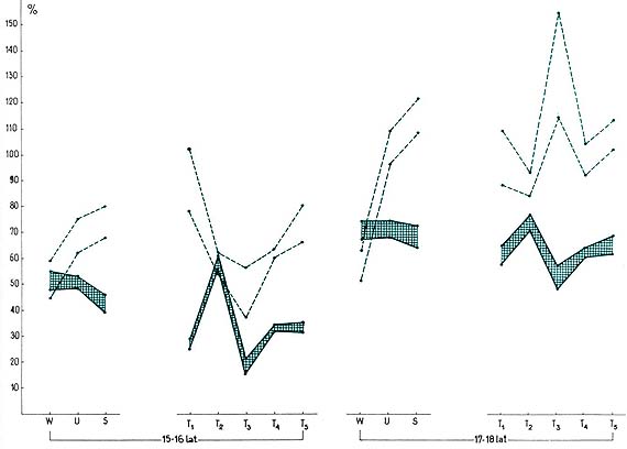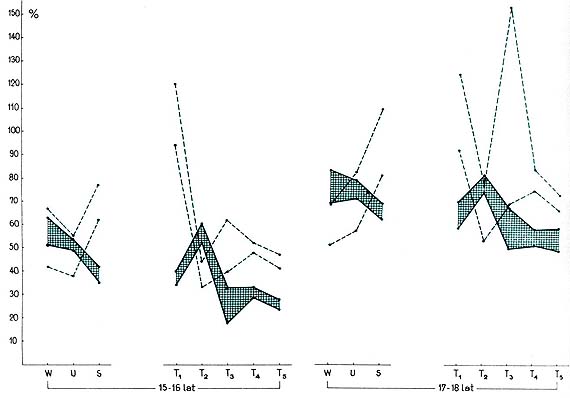 Рис. 1. Прыжки (мужчины). Диапазон нагрузок (M ± s) в зависимости от вида и интенсивности нагрузки, возраст 15-16 и 17-18 лет, прогрессивная модель тренировки (сплошная линия, площадь заштрихована), интенсивная модель тренировки (пунктирная линия, площадь не заштрихована). Обозначения здесь и на рис. 2-7: W - объем общеразвивающих нагрузок, U - объем специализированных нагрузок, S - объем специальных нагрузок, T1...T5 - нагрузки в разных зонах интенсивности, n = 312