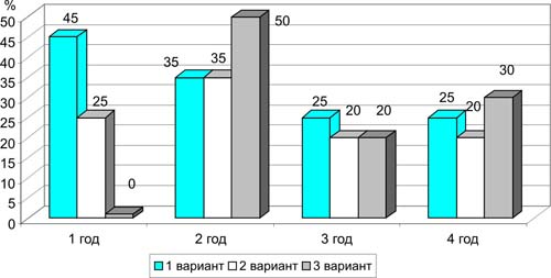 Рис. 3. Варианты моделирования прироста объема тренировочных и соревновательных нагрузок (%) в очередных годах четырехлетнего макроцикла