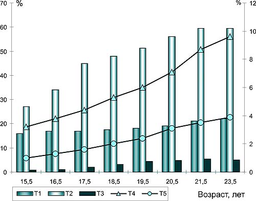 Рис. 4. Прыжки (мужчины). Рекомендуемые средние значения изменений общего объема нагрузок (T1...T5) в течение очередных лет тренировки (возраст 15,5 - 23,5 года)