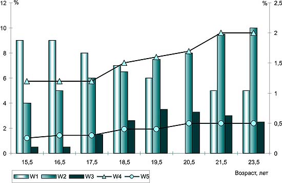 Рис. 6. Прыжки (мужчины). Рекомендуемые средние значения общеразвивающих нагрузок различной интенсивности (W1...W5) в течение очередных лет тренировки