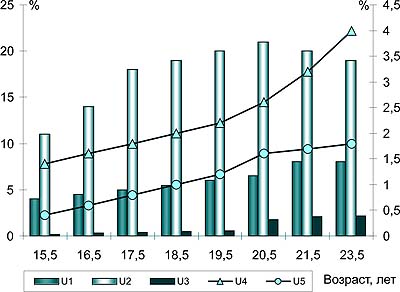 Рис. 7. Прыжки (мужчины). Рекомендуемые средние значения специализированных тренировочных нагрузок различной интенсивности (U1...U5) в течение очередных лет тренировки
