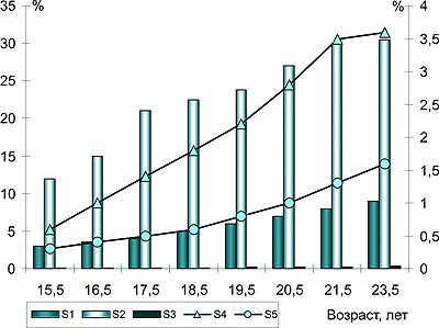 Рис. 8. Прыжки (мужчины). Рекомендуемые средние значения специальных нагрузок различной интенсивности (S1...S5) в течение очередных лет тренировки