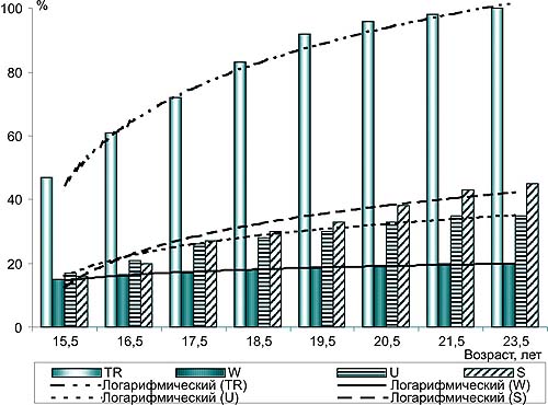 Рис. 9. Прыжки (мужчины). Рекомендуемые средние значения общего объема нагрузок (TR), а также их составляющих в зависимости от вида (W, U, S) - с нанесением логарифмических функций как тенденций изменений в течение очередных лет тренировки На рис. 2 представлены данные анализа 300 тренировочных годичных циклов женщин, специализирующихся в спринтерском беге. Видны сходство двух подходов к построению тренировочного процесса и заметная разница этих двух моделей тренировки, приводящих к различным конечным результатам. В качестве иллюстрации нами специально выбраны прыжковые и скоростно-силовые дисциплины легкой атлетики, в которых ярко проявляется это опасное, но широко используемое направление тренировочного процесса. Как свидетельствуют результаты наших исследований, решающим фактором развития спортивной карьеры является тренировочный процесс, который ведет к специфическим, долговременным адаптационным эффектам как фундаменту для достижения высоких результатов. На рис. 3 представлены три основных варианта моделирования прироста объема тренировочных и соревновательных нагрузок в очередных годах четырехлетнего макроцикла. В зависимости от стадии биологического развития, уровня подготовленности, спортивного стажа, специфики спортивной дисциплины, а также индивидуальных особенностей спортсмена используется один из рассматриваемых вариантов моделирования прироста объема тренировочных и соревновательных нагрузок. Первый вариант используют спортсмены, достигшие той стадии биологического развития, которая позволяет принять решение о целесообразности скачкообразного увеличения нагрузок в первый год олимпийского цикла. Второму варианту распределения нагрузок отдают предпочтение те спортсмены, которые в первый год олимпийского цикла еще не достигли полного биологического созревания, однако считают скачкообразный рост нагрузок приемлемым для себя. Третий вариант часто применяют те спортсмены, которые имеют большой стаж спортивной деятельности и уже участвовали в подготовке к прошедшим играм Олимпиады, но организм которых требует некоторого временного снижения нагрузок. Следующим важным, с нашей точки зрения, результатом дальнейших исследований явилась конкретизация определенной технологии - создание системы документации и обработки данных о нагрузках с использованием разработанных нами компьютерных программ. Тренировочные и соревновательные нагрузки рассматриваются, как известно, в двух категориях: - в зависимости от вида подготовки; - в зависимости от влияния нагрузки на механизмы энергообеспечения. Это дало возможность анализа и проведения лонгитудинальных исследований спортсменов в различных спортивных дисциплинах на всех этапах спортивного совершенствования. Результаты этих исследований позволили подойти к созданию прогностических моделей тренировочных нагрузок для разных спортивных дисциплин, а именно: для дисциплин с так называемым нормальным темпом развития, включающим возрастной диапазон от первых спортивных достижений до максимальных результатов. Модели предусматривают рекомендуемые нормы нагрузок и их структуру для каждого очередного года жизни (тренировки) спортсменов, специализирующихся в легкоатлетических прыжках. Примеры таких решений продемонстрированы в настоящем ра