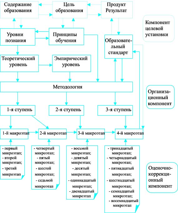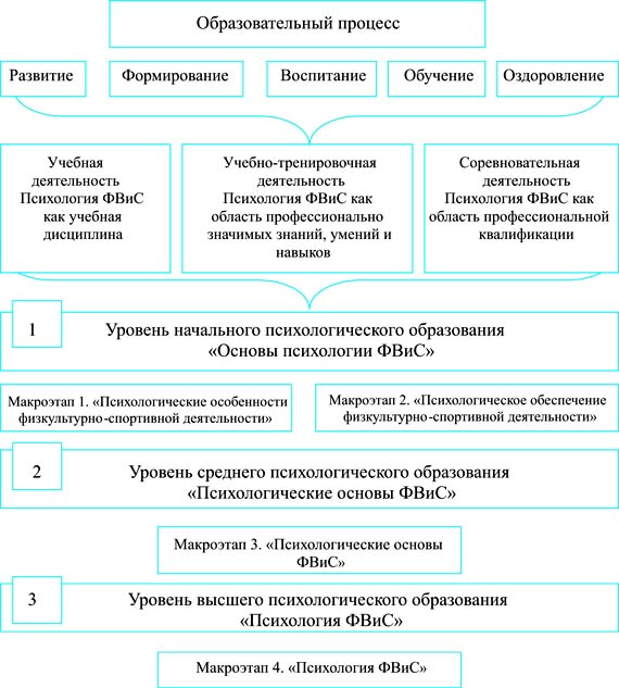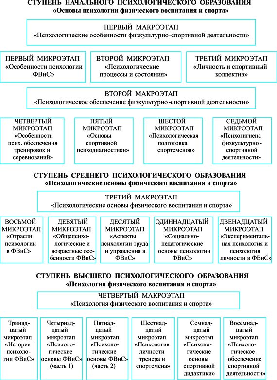 Рис. 1. Структура содержания психологического образования Наименьшей частью технологической структуры психологического образования является микроэтап (рис. 2). Каждый микроэтап имеет особую схему обучения фрагменту учебной информации: 1) сообщение знаний; 2) формирование умений на репродуктивном уровне; 3) отработка умений в учебных ситуациях; 4) переход к практическому использованию в учебно-тренировочной деятельности (имитационное моделирование, анализ, текущий контроль и оценка с участием воспитанника); 5) включение умений в соревновательную практику (обеспечение решения задач основной деятельности, проверка и оценка уровня усвоения, формирования индивидуального стиля деятельности); 6) психологическая коррекция, формирование специальных свойств личности, развитие деятельностных качеств (восстановительные мероприятия, развитие психических возможностей, коррекция личности, достижение микроинсайта в области освоения знаний и умений, формирование спортивного характера, устранение недостатков, развитие достоинств). Технология предусматривает определенное число макро- и микроэтапов обучения, которое является следствием соотношения количества соревнований в годовом периоде и количества разделов по курсу на каждом уровне образования. В объеме работы представлена базовая модель, предусматривающая усредненный показатель данных параметров (рис. 3). Особенностью системы следует считать организацию оздоровительной работы с обучающимися в ходе учебной, учебно-тренировочной и соревновательной деятельности с использованием методов психологического консультирования, психокоррекции, психопрофилактики. Технология реализации этих видов согласуется с требованиями к проведению психологической помощи4. Оценочно-коррекционный компонент рассматриваемой технологии определяется диагностикой продукта и результата образовательного воздействия 5. В нем следует различать элементы, связанные с текущей информацией, итоговым материалом макроэтапов и целостной целевой установки. Специфика психологической подготовки определяет и ряд особенностей в планировании (табл. 2).6 Таблица 1. Модель целевой установки системы психологического образования специалистов по физической культуре и спорту (по O.K. Филатову)