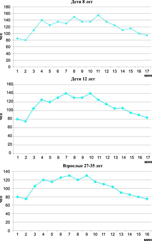 Пульсовая кривая урока оздоровительного плавания в семейных группах Для исследования общей работоспособности детей был использован облегченный вариант Гарвардского степ-теста - М-тест, в ходе которого был выявлен "хороший" уровень работоспособности у 53% имеют и "удовлетворительный" - у 47% . Через 6 месяцев занятий выявлено значительное улучшение показателей: у родителей - на 6,8 балла, у детей - на 8,9 балла. Уровень работоспособности оценивался как "отличный". Для оценки функционального состояния занимающихся нами применялись: проба с задержкой дыхания на вдохе (проба Штанге) и проба с задержкой дыхания на выдохе (проба Генчи). В результате 6 месяцев занятий выявлено достоверное увеличение времени задержки дыхания на вдохе и выдохе (р<0,001), что свидетельствует об улучшении функционального состояния дыхательной системы. Для определения динамики реакции организма на нагрузку мы использовали пульсометрию. Разнообразие упражнений и игр делало занятие более эмоциональным. Это позволило относительно высоко поднимать кривую физиологической нагрузки без большого утомления центральной нервной системы. На рисунке приведены кривые ЧСС на занятии оздоровительным плаванием в семейных группах у детей 8 и 12 лет и их родителей 27-35 лет. Согласно рисункам максимальная ЧСС у детей 8 и 12 лет при плавании кролем на груди с движениями ногами равнялась 150-155 уд/мин. Увеличение пульса по сравнению с исходным составило 55%. Исследования показали, что средние данные и максимальные показатели ЧСС во время оздоровительных занятий по плаванию у детей и взрослых находятся в пределах допустимых величин, определенных Ю.И. Савченковым и Т.Ф. Венгер [5], А.В. Кенеман и Д.В. Хухлаевой [2]. С целью изучения влияния занятий на эмоциональный контакт родителей с детьми и отношение детей к своей семье нами применялись методики PARI и Рене Жиля. Исследования показали, что у родителей уменьшилась эмоциональная дистанция с ребенком, появилось стремление ускорить его развитие, у 65% взрослых улучшился контакт с детьми. У 73% женщин снизились раздражительность, суровость. Чрезмерное вмешательство в мир ребенка после эксперимента уменьшилось у 45% взрослых. У детей появилась любознательность, повысились стремление к доминированию, общительность, снизились закрытость, отстраненность. На вопрос об эмоциях, которые наиболее точно описывают психическое состояние во время занятий оздоровительным плаванием в семейных группах, после эксперимента 78% детей ответили, что чувствуют радость и веселье, у 100% детей проявился интерес к занятиям. В то же время 88% родителей испытывают удовлетворение от продуктивных результатов своих детей и улучшение самочувствия. Психологический климат в группе можно оценить как дружелюбный, теплый, благоприятный, что позволяет сделать вывод о том, что занимающиеся удовлетворены занятиями, общением друг с другом. Таким образом, выявлено положительное влияние занятий оздоровительным плаванием в семейных группах. Использованная литература 1. Апанасенко Г.Л. Физическое развитие детей и подростков. - Киев: Здоровье, 1985. 2. Кенеман А.В., Хухлаева Д.В. Теория и методика физического воспитания детей младшего школьного возраста: Учеб. пос. для студ. пед. ин-тов. - М.: Просвещение, 1978. 3. Кучкин С.Н. Методы оценки уровня здоровья и физической работоспособности: Учеб. пос. В