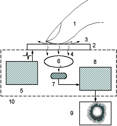Рис. 1. Схематическое изображение ГРВ-прибора. 1 - объект исследования; 2 - прозрачный электрод; 3 - газовый разряд; 4 - оптическое излучение; 5 - генератор; 6 - оптическая система; 7, 8 - видеореобразователь; 9 - компьютер; 10 - корпус Таблица 1. Половозрастные характеристики обследованных спортсменов