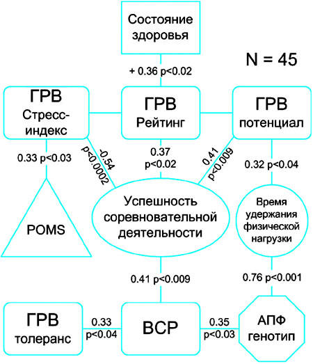 Рис. 2. Корреляционный граф параметров для группы из 40 спортсменов. Цифрами показаны коэффициенты корреляции Спирмена для p < 0,05 Регистрация ГРВ-граммы - неинвазивное, безболезненное и быстрое исследование. Его можно проводить повторно, многократно, в процессе курса терапии или в ходе различных воздействий. Биофизической основной метода ГРВ является протекание импульсного электрического тока в непроводящих биологических тканях, которое может обеспечиваться за счет межмолекулярного переноса возбужденных электронов по механизму туннельного эффекта с активированных перескоком электронов в контактной области между макромолекулами [7, 9]. Таким образом, метод ГРВ позволяет косвенным образом судить об уровне энергетических запасов молекулярного уровня функционирования структурно-белковых комплексов. Аппаратный комплекс "ГРВ", используемый при проведении ГРВ-графии, разрешен к применению Комитетом по новой медицинской технике МЗ РФ и Госстандартом России с 1999 г. и выпускается серийно (www.kti.spb.ru). 5. Генетическая предрасположенность определялась на основании выявления II, ID и DD аллелей ангиотензин-превращающего фермента (АПФ), коррелирующего с результативностью соревновательной деятельности для элитных спортсменов в видах спорта, требующих физической выносливости [10]. Геном ДНК экстрагировался из слюны, полиморфная часть гена усиливалась в полимерной цепной реакции, и продукты реакции определялись электрофорезом в 8%-ном полиамидном геле [12]. 6. Для оценки взаимосвязи получаемых параметров и их значимости при анализе соревновательной деятельности спортсменов использовались методы корреляционного и факторного анализов, а для создания моделей деятельности на основе выявленных закономерностей применялись методы искусственного интеллекта.