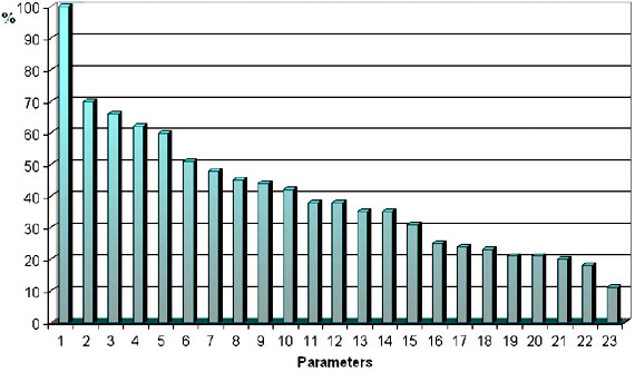 Рис. 4. Диаграмма корреляционной значимости измеренных параметров относительно успешности соревновательной деятельности за два года для 196 спортсменов в видах спорта с большими физическими нагрузками Параметры: 1 - ГРВ JS L; 2 - POMS депрессия; 3 - уровень здоровья, %; 4 - ГРВ JS R; 5 - SD ГРВ JS L; 6 - POMS разочарование; 7 - желтая масса тела; 8 - ГРВ энтропия R; 9 - уровень иммунитета; 10 - динамометрия L; 11 - диастолическое давление, mm Hg; 12 - SD ГРВ JS R; 13 - ГРВ энтропия L; 14 - ГРВ функциональный индекс; 15 - POMS активность; 16 - POMS терпение; 17 - масса тела; 18 - динамомет рия R; 19 - рост; 20 - процент жиров; 21 - ЧСС; 22 - систолическое давление, mm Hg; 23 - уровень социализации. Индекс R относится к данным правой руки, индекс L - левой Характеристика обследованного контингента представлена в табл. 1-3. Результаты исследований и их обсуждение. На первом этапе исследований были просчитаны корреляты стандартно определяемых психофизиологических параметров с многолетней результативностью успешности соревновательной деятельности (УСД), определяемой в соответствии с методикой Госкомспорта России по табл. 4. Результаты оказались достаточно неожиданными (рис. 2). Как видно из приведенного графа, коэффициенты корреляции всех параметров с УСД находятся на уровне 0,2. Исключение составляет биоэнергетический гомеостаз, вычисляемый на базе ГРВ параметров свечения пальцев рук. Анализ полученных результатов подтвердил правильность развиваемой в СПбНИИФКе в последние годы линии на поиск более эффективных коррелятов спортивной деятельности. Это привело к отбору комплекса психофизиологических и генетических факторов. Пример корреляционного графа, рассчитанного для группы исследованных спортсменов на базе развитой группы параметров, приведен на рис. 3. Как видно из приведенных данных, отобранная группа факторов имеет высокую степень корреляции с успешностью соревновательной деятельности - основного показателя эффективности работы спортсмена. Подобные результаты не явились неожиданными, т.к. они были неоднократно проверены в 2000-2003 гг. в процессе тестирования спортсменов УОР-1 и УОР-2 Санкт-Петербурга [2]. Интересно отметить, что высококвалифицированные спортсмены имеют ряд характерных особенностей паттернов ГРВ-грамм [11]. Во-первых, их ГРВ-граммы отличаются относительно высокой степенью структурированности по сравнению с таковыми у испытуемых контрольных групп (абитуриентов и студентов спортивных и неспортивных вузов того же возраста). Максимальная структурированность ГРВ-грамм обнаружена у спортсменов-пловцов высокой квалификации. Во-вторых, с большой степенью вероятности (87% случаев) ГРВ-граммы высококвалифицированных спортсменов, тренирующихся на выносливость, относятся к типам IIа и IIб по классификации, принятой в ГРВ-биоэлектрографии [5]4. При этом как комбинаторика типов ГРВ-грамм, так и их базовые параметры (площадь, фрактальные и энтропийные характеристики) достоверно различаются (р < 0,05-0,01) у групп спортсменов, имеющих различную степень функциональной готовности, которая определяется по данным тестирования стандартными верифицирующими методами.