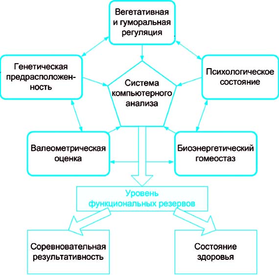 Рис. 5. Принципиальная схема биотехнической системы "Спорт для молодежи" Оценка актуального психофизического потенциала спортсменов на момент проведения обследований с позиций хронобиологии позволяет обнаружить другую закономерность - связь параметров ГРВ-грамм с периодами индивидуального года [8]. Проверка данной закономерности на большом контингенте высококвалифицированных спортсменов показала, что те из них, кто находятся в так называемых благоприятных периодах индивидуального года, отличаются наиболее высоким уровнем психоэнергетических функциональных резервов. Таким образом, есть основания полагать, что параметры ГРВ-грамм, отражающие "консервативные" (генетические) и "лабильные" (психофункциональные) признаки текущего состояния спортсмена имеют как краткосрочное, так и долгосрочное прогностическое значение. Многопараметрический (корреляционный и факторный) статистический анализ, проведенный с учетом экспертных оценок эффективности соревновательной деятельности, подтвердил дифференциально-диагностическую значимость выявленных параметров для определения психофизической выносливости спортсменов. На рис. 4 приведена диаграмма корреляционной значимости измеренных параметров относительно успешности соревновательной деятельности за два года для группы спортсменов в видах спорта с большими физическими нагрузками. Как видно из этого графика, параметры энергетики организма спортсмена, психологические факторы и параметры кардиореспираторной системы играют определяющую роль в соревновательной успешности. Основные выделенные факторы в порядке из значимости приведены в табл. 5. Полученные данные позволили разработать биотехническую экспертную систему для скрининговой оценки психофизического потенциала высококвалифицированных спортсменов (рис. 5). Комплекс включает шесть блоков: 1. Валеометрический блок для оценки качества здоровья и физической работоспособности. 2. Блок оценки психоэмоционального статуса по глубине и направленности его изменений. 3. Блок оценки вегетативной и гуморальной регуляции на базе метода вариационной кардиометрии. 4. Блок оценки состояния биоэнергетического гомеостаза на базе метода ГРВ-биоэлектрографии (в шкале "энергоизбыточность-норма-энергодефицит"). 5. Блок оценки генетической предрасположенности к физической активности. 6. Блок формирования заключений на базе компьютерных систем искусственного интеллекта. Основу развитой системы составляет набор компьютерных программ, предназначенный для экспресс-анализа ГРВ-грамм и определения следующих функциональных параметров: общий уровень биоэнергетического потенциала (в шкале "энергоизбыточность-норма-энергодефицит"); уровень психоэнергетического потенциала, непосредственно связанного с качеством психофизической выносливости; уровень стресс-толерантности и способности к психоэнергетической мобилизации. Запись параметров ГРВ-грамм паттернов пальцев рук с учетом функциональных тестов занимает не более 15 мин на одного обследуемого. Обработка данных позволяет практически в реальном масштабе времени получить персонифицированные характеристики спортсмена по указанным выше функциональным параметрам и в дальнейшем групповой рейтинг по всем обследованным. Таким образом, система способна оперативно предоста