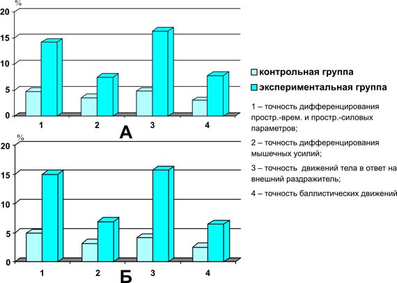 Темпы прироста точности движений у контрольной и экспериментальной группах у мальчиков (А) и девочек (Б) Физические упражнения (повороты, наклоны, взмахи, приседания, вращения) оценивалось с учетом правильности их выполнения, начиная от исходного положения до конечного. Соблюдение этих требований формирует школу движений, привычку к точности выполнения каждого элемента двигательного акта, повышает эстетичность движений, усиливает эмоциональное воздействие. Кроме ходьбы, бега и прыжков в разных направлениях занимающиеся усваивали лазанье по гимнастической стенке одноименным, разноименным и смешанным способами, перекаты в группировке, упоры стоя и лежа. Для оценки качества выполнения данных двигательных заданий были разработаны следующие критерии: - лазанье по гимнастической стенке одноименным способом : 5 баллов - одновременная постановка правой ноги и перехват правой рукой в одном темпе и ритме при сохранении прямого положения тела; 4 балла - один сбой в темпе или ритме движений, недостаточно прямое положение спины; 3 балла - два сбоя в темпе и ритме постановки рук и ног, недостаточно прямая спина, опущенная голова. Эти же критерии использовались и при других способах лазанья; - перекаты в группировке: 5 баллов - перекат назад с последовательным касанием опоры (тазобедренным суставом, лопатками, затылком), сохраняя плотную группировку (подбородок прижат к груди, колени вместе, носки оттянуты); 4 балла - недостаточно круглая спина, неплотная группировка; 3 балла - слабая плотность группировки, сбой в темпе и ритме движения. Те же критерии и при выполнении переката вперед; - упоры стоя и лежа. Оценка 5 баллов - опора на прямые руки на всю ладонь, пальцы рук направлены вперед, плечи - вертикально над кистями рук, голова между руками, смотреть перед собой; 4 балла - постановка рук несколько шире или уже плеч (не более 5 см), плечи незначительно поданы вперед (1-2 см), голова опущена; 3 балла - постановка рук шире плеч (более 5 см), плечи выходят за опору на 2-3 см, голова опущена или излишне приподнята. На первых двух занятиях школьники КГ и ЭГ выполняли на оценку (по указанным критериям) различные виды ходьбы, бега, прыжков, лазанья по гимнастической стенке, перекаты в группировке, упоры стоя и лежа (табл. 2). Для учащихся ЭГ была разработана методика обучения физическим упражнениям, основанная на точности выполнения двигательных заданий. С этой целью использовался образцовый показ каждого упражнения, обращалось внимание учащихся на взаиморасположение звеньев тела, осанку, особенности выполнения каждого элемента двигательного акта при характерных изменениях положения головы, рук, ног. Оценивались точность направления движения (прямое, косое, по кругу) при ходьбе, беге, прыжках; своевременное изменение темпа и ритма движений в ходьбе строев ым шагом, на носках, выпадами, спиной вперед, в приседе и т.д. Внимание занимающихся обращалось на изменение скорости движений и амплитуды при различных способах бега и прыжков; точность расположения звеньев тела при разных исходных положениях (руки на пояс, к плечам, за голову, за спину, в стороны, вверх, вперед и т.д.). Контролировалось сохранение осанки при выполнении каждого последующего двигательного задания, указывалось на недопустимость задержки дыхания. В подготовительных и заключительных частях уро