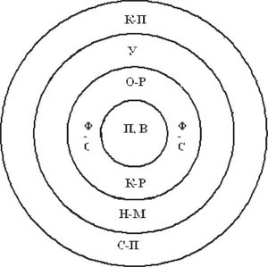 Структура профессиональной деятельности учителя физической культуры. Условные обозначения видов профессиональной деятельности: П - преподавательская, В - воспитательная, Ф-С - физкультурно-спортивная, О-Р - оздоровительно-рекреативная, К-Р - коррекционно-разви вающая, Н-М - научно-методическая, У - управленческая, К-П - культурно-просветительская, С-П - социально-педагогическая В центре находятся преподавательская и воспитательная деятельность. Они составляют ядро профессиональной деятельности любого учителя, так как без одного из этих видов деятельности теряется смысл профессии педагога. Физкультурно-массовая, оздоровительно-рекреативная и коррекционно -развивающая деятельности составляют основу профессии учителя физической культуры и определяют ее специфику по сравнению с педагогической деятельностью учителей других учебных предметов. Научно-методическая и управленческая деятельности повышают эффективность вышеназванных видов профессиональной деятельности учителя физической культуры, культурно -просветительская и социально-педагогическая деятельности придают профессии учителя физической культуры социальную значимость. При таком понимании проблемы формирование индивидуального стиля деятельности есть главным образом процесс осознания, воспроизведения, реконструкции субъектом (студентом) объективно существующих закономерностей, присущих данной профессии, причем степень адекватности этого осознания и реконструкции будет выражаться в большей или меньшей целостности и эффективности конкретных стилей, которые он считает для себя предпочтительными. Литература 1. Амонашвили Ш.А. Личностно-гуманная основа педагогического процесса. - Минск: Изд-во Минского ГУ, 1990. - 560 с. 2. Борисенко Н.М. Психолого-педагогические основы развития творческой индивидуальности будущего специалиста-педагога: Автореф. канд. дис. Ставрополь, 1998. - 24 с. 3. Борытко Н.М. Пространство воспитания: образ бытия: Монография. - Волгоград: Перемена, 2000, с. 92-94. 4. Гребенюк О.С., Гребенюк Т.Б. Основы педагогики индивидуальности: Учеб. пос. Калининград, 2000. - 572 с. 5. Климов Е.А. Индивидуальный стиль деятельности в зависимости от типологических свойств нервной системы: Автореф. докт. дис. Л., 1968. - 46 с. 6. Климов Е.А. Образ мира в разнотипных профессиях: Учеб. пос. - М.: МГУ, 1995. - 216 с. 7. Коротаев А.А., Тамбовцева Т.С. Психологическая характеристика типов индивидуальных стилей педагогического общения // Интегральное исследование индивидуальности: Теоретические и педагогические аспекты. Пермь, 1988, с. 23-31. 8. Котова И.Б., Шиянова Е.Н. Педагог: профессия и личность. - Ростов-на-Дону: Изд-во Ростовского педуниверситета, 1997. - 144 с. 9. Крикля Н.П. Индивидуальные стили педагогического оценивания: Автореф. канд. дис. М., 1997. - 24 с. 10. Мерлин В.С. Типологически обусловленные особенности в труде и производственном обучении ткачих // Проблемы психологии личности и психологии труда / Под ред. В.С. Мерлина. Пермь, 1960, c. 5-57. 11. Мерлин В.С. Очерк интегрального исследования индивидуальности. М., 1986, c. 166. 12. Моросанова В.И. Индивидуальный стиль саморегуляции: феномен, структура и функции в произвольной активности человека. - М.: Наука, 1998. - 192 с. 13. Наумова А.Е. Индивидуализация профессионально-педагогической подготовки студентов педагогических вузов на завершающем этапе обучения (в условиях многоуровневой