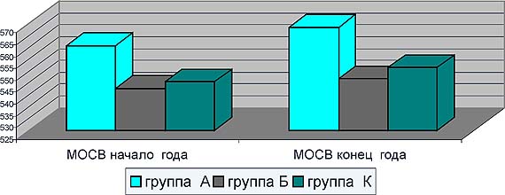 Физическое состояние студентов оценивали в соответствии с нормативами учебной программы вуза. Одновременно с физическими параметрами проводили тестирование: фиксировали максимальную объемную скорость выдоха (МОСВ) с помощью пикфлоуметра "Феррарис", функциональную (20 приседаний за 40 с) и гипоксическую пробу (пробу Штанге). Динамика двух первых показателей представлена на рис. 1 и 2. Главная методическая особенность занятий в обеих экспериментальных группах состояла в следующем: несмотря на то что занятия в экспериментальных группах были построены по разным принципам, один и тот же студент получал разнообразные нагрузки, так как в зависимости от своего исходного ПФС он попадал в разные подгруппы. В итоге общий объем нагрузок, выполненный студентами в четырех подгруппах, был практически одинаков. Методика, предложенная в группе А позволила достоверно ( p< 0,01) улучшить скоростные качества (бег 60 м, плавание 50 м в/с), общую выносливость (бег 3000 м) и силовую выносливость занимающихся (количество подтягиваний на перекладине). Табл. 2 иллюстрирует эту динамику. Показатели функциональной пробы во всех группах в конце года достоверно улучшились, при этом наибольшее снижение частоты пульса на первой и третьей минуте восстановления наблюдается в группе А (см. рис. 1) В группе А зафиксировано существенное увеличение максимальной объемной скорости выдоха (р<0,01). В других группах данный показатель существенно не изменился (см. рис. 2) Показатель гипоксической пробы остался на прежнем уровне во всех группах. На рис. 3 представлены результаты в плавании 50 м вольным стилем по трем группам испытуемых. Эти рисунки показывают конкретный результат каждого участника эксперимента. Такая форма сопоставлений позволяет увидеть, что наибольший прирост произошел у тех студентов, которые показали первоначальный результат хуже 40 с. Прирост результатов в плавании на 50 м в группах составил: в группе А - более 8%, а в группе В - 2,4% , в группе К -2,8%. В результате педагогического эксперимента была подтверждена гипотеза о том, что физические упражнения (средства оздоровительного плавания) влияют на ПФС занимающихся. Методика, примененная на занятиях с группой А (когда при исходном чрезмерно повышенном ПФС его понижали за счет специальных физических упражнений и наоборот) позволяет улучшить физическую подготовленность студентов и их функциональное состояние. Использование методики САН является необходимой и достаточной процедурой определения ПФС учащихся. Таблица 2. Изменение оценок по контрольным нормативам в течение года, %