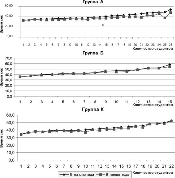 Рис. 3. Результаты плавание на 50 м вольным стилем в 3 подгруппах. Поскольку ее использование и обработка результатов не представляют сложности для педагога практика. Литература 1. Бянкина Л.В. Формирование оптимальной системы учебной деятельности у студентов физкультурного вуза: Автореф. канд. дис. Хабаровск, 1999. 2. Вайник Г.А. Дифференцированный подход в физическом воспитании студентов на основе контроля их психофизического состояния: ( на примере групп ОФП ): Канд. дис. СПб., 1995. - 174 с. 3. Виленский М.Я. Студент как субъект физической культуры // Теория и практика физ. культуры. 1999, №10, с. 2-5. 4. Выдрин В.М., Зыков Б.К., Лотоненко А.В. Физическая культура студентов вузов: Учеб. пос. - Воронеж: Изд-во ВГУ, 1991 г. - 128 с. 5. Гагин Ю.А. Становление и реализация индивидуальности субъектов педагогического процесса в образовании и спорте: Автореф. канд. дис. СПб., 1996. 6. Ганчар И.Л. Плавание: Теория и методика преподавания: Учеб. - Минск: Четыре четверти; Экоперспектива, 1998. - 352 с. 7. Жбанков О.В., Толстой Е.В. Технология контроля психофизического состояния студентов и управление им // Теория и практика физ. культуры. 1997, № 8, с. 40-43 8. Коваленко В.А. Физическая культура в обеспечении здоровья и профессиональной психофизической подготовки студентов /Физическая культура и спорт в Российской Федерации (студенческий спорт) /Сб. ст. - М.: Полиграф сервис, 2002. 9. Лотоненко А.В. Молодежь и физическая культура. - М.: - ФОН, 1996. - 317 с. 10. Льдокова Г.М. Динамика негативных психических состояний студентов СПУЗ в ситуациях учебной деятельности с неопреденным исходом: Автореф. канд. дис. Казань, 2000 - 18 с. 11. Марищук В.Л. Блудов Ю.М., Плахтиенко В.А. и др. Методики психодианостики в спорте. -М.: Просвещение,1984. 12. Платонов В.П. Плавание. - Киев: Олимпийская литература. 2000. - 495 с. 13. Примерная программа дисциплины "Физическая культура" федерального компонента цикла общегуманитарных и социально-экономических дисциплин в государственном образовательном стандарте высшего профессионального образования второго поколения. Издание официальное. М., 2000. 14. Рогалёва Л.Н., Малкин В.Р., Беляева В.В. Психофизическая культура - новая идеология физической культуры в вузе: Матер. междунар. конф. "Организация и методика учебного процесса, физкультурно-оздоровительной и спортивной работы". - М. Изд-во Московского университета, 2000, с. 16-21. 15. Хлупина Л.И. Роль физического воспитания в адаптации студентов к условиям вуза: Канд. дис. Л., 1980. 16. Царегородцева Л.Д., Жукова Е.М., Тиунова О.В. Исследование индивидуального физического и психофизического состояний студентов в процессе занятий плаванием: Матер. междунар. конф. "Организация и методика учебного процесса, физкультурно-оздоровительной и спортивной работы". Матер. междунар. конф. Ч. 2. - М.: Изд-во Московского университета, 2000, с. 16-21. 17. Якубовская А.Р., Изаак С.И. Коррекция психофизического состояния лиц пожилого возраста методом комплексного использования двигательных и психорегулирующих средств воздействия: Метод. реком. 2001.