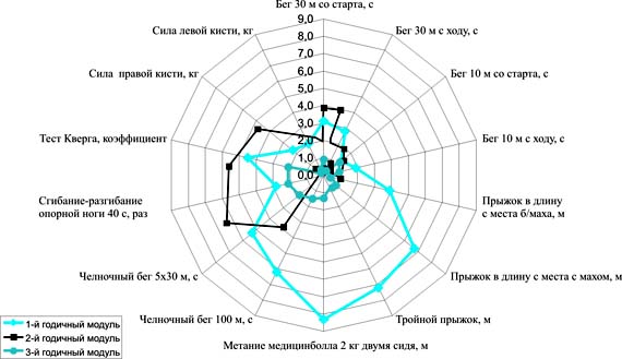 Динамика темпа прироста показателей физической подготовленности юных футболистов 12-15 лет в трех последовательных годичных модулях Кроме того, специфика соревновательной деятельности в спортивных играх требует овладения юными спортсменами на этой стадии широким арсеналом технических действий, поскольку, по мнению большого числа специалистов, именно до начала предкульминационного этапа закладываются основы технического мастерства спортсменов, отсутствие которые будет сложно восполнить в дальнейшем. Это, в свою очередь, определит высокую значимость технической подготовленности и высокие парциальные объемы работы, направленной на овладение элементами техники игры и их технико-тактическими вариантами в каждом годичном макроцикле этой стадии. Проектирование макроцикла может осуществляться на традиционной основе - с делением на "классические" периоды и этапы, но может иметь и несколько отличные формы. В настоящее время стали достаточно широко применяться следующие структурные варианты макроцикла: тренировочно -соревновательные комплексы, модульная структура подготовки, блочное построение макроциклов и другие формы. При этом продолжительность макроцикла определяется его соответствием школьному учебному году и приравнивается к годичной. В модульно-блочной структуре макроцикла каждый тренировочный блок характеризуется определенной преимущественной направленностью работы, смысловой законченностью и требованиями к уровню подготовленности (табл. 1). Это предполагает развертывание целенаправленной тренировочной работы по воспитанию физических качеств (скоростных и скоростно-силовых, выносливости, гибкости и двигательно -координационных возможностей); изучению и отработке техники вида спорта с повышением в каждом блоке требований к скорости и точности выполнения технических действий; изучению и отработке технико-тактических действий в условиях группового и командного взаимодействия. Подобная организация тренировочной работы в блоках и возможность сличения модельных и демонстрируемых показателей позволяют осуществлять текущую коррекцию содержания работы и соотношений разделов в следующем блоке годичного модуля. Примером модульно-блочной структуры макроцикла на стадии базовой подготовки может служить проект, включающий три последовательных по структуре и содержанию модуля подготовки (окологодичной продолжительности) юных спортсменов в мини-футболе (12-15 лет). 3-летний макроцикл (соответствующий этапу основной базовой подготовки) был построен на основе трех преемственных модулей окологодичной продолжительности (типа традиционных окологодичных макроциклов) с входящими в них блоками обучения (технике игры) и воспитания (физических качеств), а также контрольно -реализационными блоками, в которых приобретается соревновательный опыт, совершенствуются отдельные интегральные стороны подготовленности, выявляется динамика влияния тренировочных воздействий по показателям тестирования различных сторон подготовленности. Учитывая важность этапа для дальнейшего совершенствования спортивного мастерства игроков и возрастные особенности развития спортсменов 12-15 лет (период полового созревания и связанные с этим функциональные перестройки), акцент в тренировочной работе был смещен в сторону тех