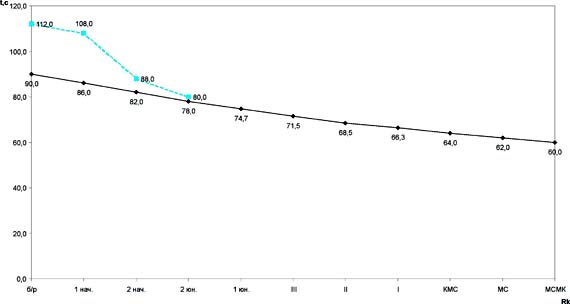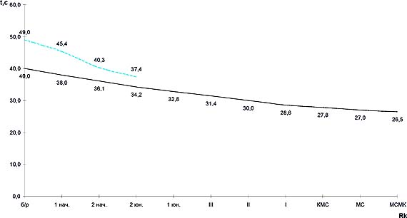 Рис. 2. Сравнение запланированных показателей начинающих футболисток 10-12 лет в беге на 400 м с полученными результатами: - запланированный результат; - - - - - - фактический результат 5. Продолжительность тренировочного периода (Li) для каждого метаболического режима в пределах предсоревновательного мезоцикла. 6. Максимальная частота (i28) включения в тренировочную программу нагрузки, относящейся к конкретной биоэнергетической зоне (в пределах тренировочного периода). Продолжительность тренировочных периодов для отдельных метаболических режимов (Li) получаем из таблиц, подобных табл. 2, в которых представлены параметры беговой нагрузки для начинающих футболисток. На схеме предсоревновательного мезоцикла отмечаем тренировочные дни, определенные для проработки отдельных метаболических режимов. Анализ исследования выполнен методом сравнения результатов тестирования беговой и технической подготовленности начинающих футболисток с моделью их развития по годам обучения. Результаты эксперимента . 1. Для вратарей, защитниц и нападающих рост общего среднего результата в беге на 200 м составил 11,6 с. По каждому отдельному амплуа ситуация выглядит следующим образом: вратари - 11,2 с; защитницы - 12,7 с; нападающие - 9,15 с. Наибольшее влияние беговая нагрузка, предназначенная для проработки превалирующего метаболического режима N4 (200 м), оказывает на игроков линии обороны, т.е. в целом подтверждается гипотеза, согласно которой при определенной тренировке защитницы со временем смогут состязаться с нападающими в скоростных качествах при беге на короткие дистанции. Сравнение планируемых и достигнутых результатов юных футболисток в беге на 200 м мы представили на графике функций t=f(Rk) (см. рис. 1). 2. Общий средний результат бегуний на 400 м повысился на 32 с. Сравнение планируемых и достигнутых результатов футболисток -полузащитниц в беге на 400 м приведено на рис. 2. По аналогии с графиком, составленным для 200 м, можно обнаружить некоторое расхождение средних результатов на начальном этапе, отдельные же достижения некоторых игроков середины поля практически полностью совпадают с прогнозируемыми результатами. Анализ результатов педагогического эксперимента привел нас к необходимым и достаточно важным умозаключениям: 1. Предлагаемый научно обоснованный подход позволяет четко спланировать беговую подготовку начинающих футболисток. 2. Применение данной методики приводит к весьма существенному (в несколько раз) сокращению традиционных объемов функциональной подготовки (беговой нагрузки), что особенно важно для начинающих футболисток в плане сохранения здоровья и потенциала для большого спорта. 3. Соревновательная деятельность исследуемой женской футбольной команды 1991 г.р. в течение трех учебных лет (37 игр: +16 =10 -11 (в т.ч. с командами юношей), мячи - 113 : 102, ср. результативность - 3 гола за игру), спортивные достижения (серебряные призеры первенства Новосибирской области-2004, бронзовые призеры зоны Сибирь-Дальний Восток-2004) и качество игры позволяют констатировать, что функциональная и техническая подготовленность начинающих футболисток находится на хорошем уровне. 4. Точный научно обоснованный расчет и простота применения, а также то обстоятельство, что полученные конкретные практические параметры тренировочного процесса для исследуемого контингента м
