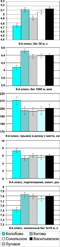 В ходе проведения педагогического эксперимента ежегодно за учащимися всех сельских школ осуществляли педагогический контроль. Во всех экспериментальных группах (ЭГ) наблюдался рост уровня физической подготовленности, что связано с естественными процессами роста и развития организма школьников. При этом у детей из ЭГ сельской общеобразовательной школы пос. Колобово отмечены более высокие показатели уровня физической подготовленности и меньшее количество простудных заболеваний в течение учебного года. Результаты тестирования развития физических качеств у юношей 8-х классов, тренирующихся по футболу в школьном спортивном клубе "Колтекс" на протяжении трех лет, свидетельствуют о достоверно значимых приростах регистрируемых показателей (табл. 1 и 2, рисунок). В конце педагогического эксперимента показатели ценностных ориентаций, уровень знаний и умений по основам здорового образа жизни у сельских подростков 7-8-х классов ЭГ выше, чем у их сверстников из КГ других сельских школ. Заключение. Педагогический эксперимент с участием подростков сельской общеобразовательной школы в рамках спортивного клуба показал, что организация системы физкультурно-спортивной работы может быть эффективной при тесном сотрудничестве педагогического коллектива школы, детей и их родителей и взаимодействии со всей инфраструктурой сельского социума. Организация физкультурно-спортивной работы в условиях школьного спортивного клуба предоставила более широкие возможности для соревновательной деятельности и способствовала привлечению педагогического коллектива и родителей к воспитанию основ здорового образа жизни в семье. Предложенная система занятий физическими упражнениями с учащимися 7-16 лет во внешкольной работе имеет не только высокий оздоровительный эффект, но и значительную воспитательную ценность. Педагогические возможности физкультурно-спортивной деятельности позволили поставить заслон негативным наклонностям подростков, корректировать поведение, сохранять и укреплять здоровье, формировать здоровый образ жизни, основы физической культуры личности.
