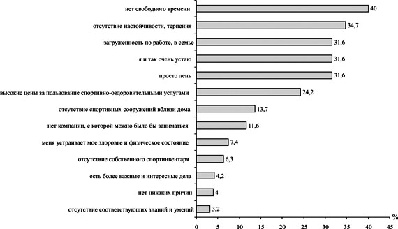 Распределение ответов на вопрос: "Какие причины мешают Вам заниматься физической культурой и спортом?" Для воздействия на свое здоровье и физическое состояние педагоги чаще всего используют сауну, лекарственные препараты и массаж; менее популярны - диета, аутотренинг и дыхательные упражнения. Особо следует подчеркнуть, что подавляющее большинство педагогов не курят (89,7%), не употребляют алкогольных напитков (39,8%) или делают это чрезвычайно редко (59,3%) и никогда не употребляли наркотиков. Учитывая анонимность анкет, полагаем, что это достоверные результаты. Наряду с анкетным опросом педагогов, работающих в гимназиях и лицеях, в этих же инновационных школах с целью выявления уровня валеологической подготовленности проведено анкетирование учащихся старших классов. В анкетном опросе приняли участие 254 старшеклассника. Свое состояние здоровья оценили как отличное и хорошее 63,5% девушек и 71,7% юношей, обучающихся в инновационной школе. Данные результаты мы согласовывали с объективными показателями их заболеваемости. Оказалось, что среди опрошенных гимназистов заболеваемость (по обращаемости в медицинские учреждения) составила 70%; количество часто болеющих школьников (более 4 раз в год) - 1,5%; на диспансерном учете по поводу хронических заболеваний состоят 23% опрошенных. Следовательно, учащиеся несколько переоценивают показатели физического здоровья. При ответе на вопрос: "Какие факторы, по-вашему, наносят наибольший вред здоровью?", большинство школьников (79%) на первое место поставили наркотики, на второе - переедание (58,1%) и на третье - курение и малоподвижный образ жизни. Парадоксально, что при этом 30% опрошенных курят, а 70% употребляют (возможно, очень незначительно, но все же) спиртные напитки, а 4% пробовали наркотики. Для сохранения и укрепления своего здоровья систематически занимаются в спортивной секции лишь 32% гимназистов, посещают сауну - 21% и тренажерный зал - 18,6% опрошенных. При ответе на вопрос о причинах небольшой физической активности гимназисты назвали в первую очередь учебную загруженность. Оказалось, что учебная нагрузка у них составляет до 10 ч в день (7-8 уроков в школе и 2-4 ч на подготовку домашних заданий). 28% опрошенных гимназистов ответили, что у них есть более важные дела, 23,2% объясняют физическую пассивность отсутствием вблизи дома спортивных сооружений, спортивных секций. Большинство опрошенных школьников считают, что заниматься физическими упражнениями необходимо, чтобы: 1) быть здоровым (86%), 2) иметь красивую фигуру (81%) и быть сильным (48,9%). При изучении интересующих гимназистов валеологических тем мы выяснили, что их привлекают темы, касающиеся регулирования массы тела (48,9%), физического совершенствования (38,2%), полового воспитания (32,2%), потребления наркотиков (18,6%). Установлено, что основным источником информации в вопросах, касающихся здоровья и физического совершенствования, являются телевидение (86%), периодическая печать (65,1%) и беседы с родителями (46,5%). Незначительную информацию в этих вопросах дают учителя школы (15%). Таким образом, в ходе нашего исследования мы выявили пробелы и противоречия в валеологической подготовленности учителей и учащихся современной школы. Полученные результаты позволяют сделать следующие выводы: 1) учителя инновационных школ оценивают состояние здоровья современных школьнико