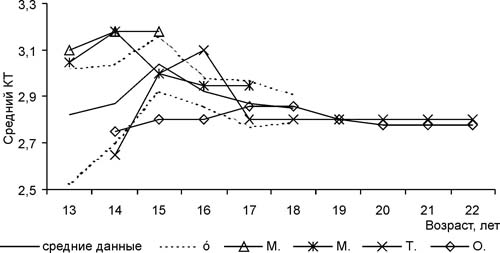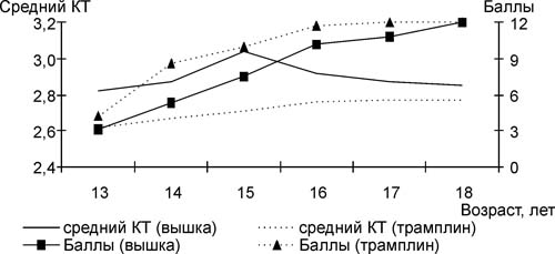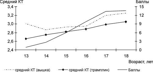 Рис. 3. Сопоставление динамики коэффициен та трудности с суммарным баллом биологической зрелости спортсменов экстра-класса в прыжках с вышки лет, когда каждый из признаков оценивается от 1 до 3 баллов. Наиболее сильное отставание от стандартов биологического развития по суммарному баллу биологической зрелости наблюдается в период с 13 до 16 лет и составляет в среднем 1 балл. После 16 лет отставание сокращается, и к 17 годам прыгуны в воду по биологической зрелости соответствуют школьникам, не занимающимся спортом. При этом половое созревание к 18 годам не завершается. Таким образом, по темпам биологического созревания прыгунов в воду можно отнести к ретардированному типу. Корреляционный анализ, выполненный для выявления взаимосвязи спортивно-технических показателей с признаками биологической зрелости женщин, специализирующихся в прыжках в воду с трамплина и вышки, показал, что в 13-летнем возрасте ретардированые спортсменки более качественно выполняют прыжки с трамплина. А в 15-16 лет качество исполнения прыжков с обоих снарядов положительно связано с такими признаками биологической зрелости, как становление менструальной функции и развитие молочной железы. В 17 лет выявлена достоверно значимая положительная взаимосвязь сложности прыжков с вышки с баллом формирования менструальной функции, что свидетельствует о преимуществе девушек, достигших половой зрелости. Выявленные взаимосвязи косвенно свидетельствуют о том, что наиболее проблемным этапом в подготовке женщин является период, связанный с процессом становления менструальной функции. У мужчин сложность прыжков с трамплина на достоверно значимом уровне связана с суммарным баллом биологической зрелости в возрасте 15 лет, а прыжков с вышки - в возрасте 16 и 18 лет. Это свидетельствует о том, что в данных возрастных периодах временное преимущество имеют более акселерированные мальчики. Сопоставление динамики коэффициентов трудности (КТ) произвольных прыжков с суммарным баллом биологической зрелости спортсменов позволило определить средние баллы биологической зрелости для каждого возраста и наиболее характерные изменения в динамике спортивных достижений. Наиболее благоприятным периодом роста спортивных достижений женщин в прыжках с вышки является период онтогенеза, соответствующий 5-8 баллам биологической зрелости (14 - 15 лет), после чего возможно снижение сложности прыжков. У "трамплинисток" увеличение сложности прыжков происходит равномерно. После достижения 11,5 балла биологической зрелости снижения сложности прыжков с трамплина и вышки не наблюдается, что приблизительно соответствует возрасту 16 лет для девушек, выступающих в прыжках с трамплина, и 17,5 года - с вышки. У мужчин рост сложности прыжков с трамплина и с вышки замедляется при достижении 3 баллов биологической зрелости (14 лет), а по достижении 9,5 балла (с 16 лет) вновь увеличивается способность овладения сложными прыжками как с вышки, так и с трамплина, что объясняется изменениями физических возможностей спортсменов, происходящими в период интенсивного роста и гормональной перестройки мужского организма [2] (рис. 2). Подтверждением полученных закономерностей может служить динамика биологического развития и спортивных достижений спортсменов экстра-класса (мужчин и женщин). Так, спортсмены экстра-класса