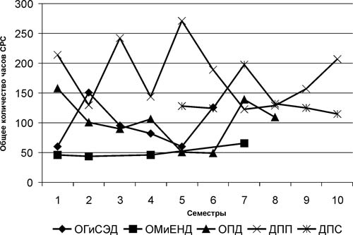 Рис. 2. Распределение количества часов СРС по блокам дисциплин за период подготовки в вузе. Примечание. ОГиСЭД - общие гуманитарные и социально-экономические дисциплины; ОМиЕНД - общие математические и естественно-научные дисциплины; ОПД - общепрофессиональные дисциплины; ДПП - дисциплины предметной подготовки; ДДС - дисциплины дополнительной специальности