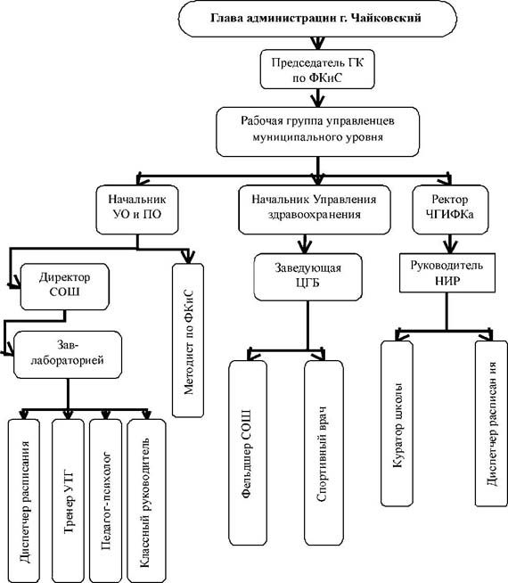 В принятой на заседании Госсовета Российской Федерации 30 января 2002 г. "Концепции развития физической культуры и спорта в Российской Федерации на период до 2005 года" предусматривалась четкая система мер по оздоровлению детей, подростков и молодежи. Однако на региональном уровне данная стратегия практически не реализована. Особенно это касается детского и юношеского спорта, массовой физической культуры для населения города. Существует определенный положительный опыт работы в данном направлении в Татарстане, Ростовской и Тюменской областях. Физическая культура, по мнению О.Н. Пряхина, - сложная система, одно из свойств которой как отрасли состоит в том, что она представляет собой многоуровневую систему специальных физкультурных государственных учреждений и общественных организаций [6]. Взаимодействие этих учреждений и организаций физической культуры происходит иерархически, т.е. часть из них осуществляет управление другими, придавая целенаправленность и скоординированность их деятельности. В процессе такого управления возникают специфические связи: вертикальные - между физкультурными организациями различных уровней; горизонтальные - между организациями, находящимися на одном и том же уровне, т.е. налицо взаимодействие систем управления. Как и в социальном управлении, в управлении физической куль турой происходит диалектическое объединение двух подсистем: управляемой, которую обычно называют объектом управления, и управляющей, называемой субъектом управления. Объектом социального управления, в какой бы форме и на каком бы уровне он ни выступал, реально и фактически являются люди. Интересен опыт патронажа массовой физической культуры в некоторых европейских странах. Так, в Англии все муниципальные спортивные плоскостные сооружения безвозмездно предоставлены общеобразовательным учреждениям для проведения занятий и спортивных мероприятий, в Германии федерации футбола, биатлона естественным путем привлекают в свои ряды подрастающее поколение, организуют для них отборочные состязания, предоставляя оборудование и инвентарь для образовательных занятий в школах. В России, Пермском крае, на муниципальном уровне для всей отрасли физической культуры субъектом управления выступает Городской комитет по физической культуре, спорту и туризму. Одна из первоочередных задач комитета - улучшение спортивной базы и управление качеством физкультурного и спортивного образований на муниципальном уровне. В г. Чайковском Пермского края на сегодняшний день реализация данного направления усугуб ляется рядом обстоятельств, одно их которых - передача полномочий финансирования отрасли из бюджета города в юрисдикцию областного центра г. Пермь. Такое положение, названное "оптимизацией", привело к изменению штатных расписаний федераций и их структурных подразделений. Как показало время, с данной обстановкой мы уже встречались в начале 90-х гг., когда из-за отсутствия финансирования на местном уровне приказали долго жить детские клубы по месту жительства, массовая физическая культура и спорт для всех стали призрачными для большинства слоев населения города. В современных условиях "оптимизации образования" в общеобразовательных учреждениях происходит аналогичная ситуация. В 1,2 раза сокращается штатное финансирование дополн