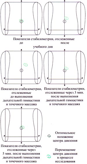 Исследование основной стойки школьников до и после выполнения дыхательной гимнастики и точечного массажа Физиологический механизм, объясняющий изменения умственной работоспособности, показателей свойств нервной системы, а в целом функциональной лабильности ЦНС, включает активность мозговых структур всех трех уровней, важнейшим компонентом которого является усиление активирующего влияния РФ и структур дыхательного центра на кору больших полушарий головного мозга. Правомерность такого заключения подтвердилась результатами электроэнцефалографических исследований, которые показали, что после выполнения дыхательной гимнастики и точечного массажа происходит повышение активности клеток коры головного мозга. При этом функциональное состояние высших отделов ЦНС, возможно, позволяет принимать более экономичные и эффективные решения. Организация комплекса афферентных возбуждений, способного дать определенную программу действий, приобретает более стабильный характер. Анализ показателей координационных свойств ЦНС школьников при стабилометрическом исследовании позволил предположить, что после выполнения дыхательной гимнастики и точечного массажа рефлекторных зон тройничного нерва импульсы из РФ ствола мозга, дыхательного центра, коры больших полушарий головного мозга оптимизируют действие вестибулярного аппарата, зрительной, проприоцептивной системы, вследствие чего улучшаются координационные свойства ЦНС школьников. Известно, что одной из особенностей функции РФ является организация двигательной активности при участии вестибулярных и зрительных нейронов [14, 15]. В процессе исследования выявлено, что школьники после выполнения дыхательной гимнастики и точечного массажа точнее воспроизводят временные интервалы разной длительности. Исходя из результатов Б.И. Цуканова [16], который рассматривает мозг как универсальный часовой механизм, измеряющий ход субъективного времени, можно предположить, что в природе человеческой популяции встречаются различные "часовые механизмы": от "хороших" до "плохих" часов. Аналог "хороших" часов следует рассматривать как одну из предпосылок высокого интеллекта [16]. Если индивид родился с "хорошими" часами, то у него есть потенциальная возможность проявить и высокий уровень понимания, широту познания. Мозг, как и часовой механизм с высокой степенью организованности и упорядоченности, обладает качеством производить высокоорганизованную и упорядоченную психофизиологическую функцию любого уровня. Поэтому мы предполагаем, что количественные параметры протекания психофизиологических реакций у человека связаны с характеристиками хода "хороших" часов. Согласно сложившимся представлениям в основе восприятия и отражения человеком времени лежит некая субъективная единица времени: "субъективный временной эталон", "собственная единица времени", которая хранится в долговременной памяти; она определяется врожденными функциональными возможностями мозга индивида и обусловливает, вероятно, наличие индивидуальной устойчивости тенденций к переоценке или недооценке периодов времени. Нами установлено, что после выполнения дыхательной гимнастики и точечного массажа уменьшается количество школьников, имеющих длинные диапазоны временных интервалов. До выполнения дыхательно