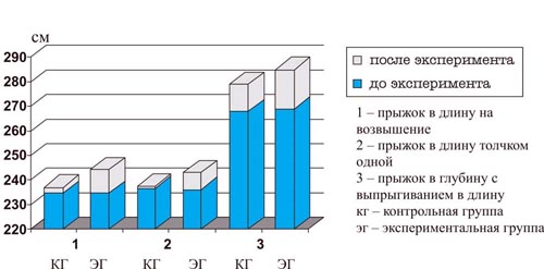 Темпы прироста показателей прыгучести в контрольной и экспериментальной группах С этой целью в содержание каждого тренировочного занятия включались следующие упражнения: - прыжок в длину с места толчком двумя со взмахом руками (на скорость и дальность приземления). Скорость движений регистрировалась по звуковому сигналу электромиллисекундомера; дальность - по специальной разметке. Одновременно обращалось внимание на формирование ритма движений. Индивидуально для каждого занимающегося с помощью метронома определялась примерная продолжительность подготовительной и основной фаз движений. Степень согласованности движений верхних и нижних конечностей определялась визуально по звуковому сигналу, что в определенной мере влияло на дальность прыжка; - прыжок в длину с одного шага со взмахом руками с аналогичными целевыми установками на овладение рациональным ритмом двигательных действий и управлением степенью согласованности движений верхних и нижних конечностей. При выполнении каждой последующей попытки делалась установка на увеличение скорости и силы отталкивания. Для дифференцирования мышечных усилий использовался утяжеленный пояс весом от 3 до 5 кг; - прыжок в длину с трех шагов разбега со взмахом руками, отталкиваясь от планки, с установлением индивидуального ритма двигательных действий и достижением оптимальной согласованности движений верхних и нижних конечностей. Для каждого из трех шагов разбега устанавливался индивидуальный ритм, определялось рациональное время подготовительных и основных движений руками для их сочетания с моментом отталкивания от опоры. По мере усвоения ритма выполнения прыжка в длину с трех шагов разбег увеличивался до пяти, затем до семи шагов. С увеличением продолжительности разбега соответственно происходило изменение ритма и характера движений рук. С целью контроля за эффективностью двигательных действий использовались метроном и специальная разметка, проверялась точность попадания на место отталкивания и измерялась длина прыжка. Попеременно выполнялись попытки с применением утяжеленного пояса. Особое внимание уделялось технике выполнения предпоследнего и последнего шагов перед отталкиванием. При выполнении двойного скачка с разбега давалась установка на увеличение скорости выполнения второго скачка по отношению к первому, а также обращалось внимание на характер изменения ритма двигательных действий. Занимающиеся определяли момент приложения основного усилия. При выполнении прыжка в длину после прыжка в глубину главное внимание уделялось выявлению оптимального момента отталкивания от опоры в сочетании со взмахом руками. Проявление мышечных усилий в момент отталкивания определялось по показателям динамометра, закрепленного на поясе занимающегося. Быстрота и ритм движений задавались системой звуковых сигналов. Спортсмены ЭГ получали задание сконструировать собственные варианты двигательных заданий; предусмотреть различные условия выполнения, способствующие повышению их эффективности. Творческое содружество студентов и тренера стимулировало интеллектуальную и моторную деятельность, повышало интерес к занятиям. Такой подход к организации учебно-тренировочного процесса позволял более успешно поэтапно осваивать сложные двигательные задания, ра