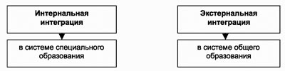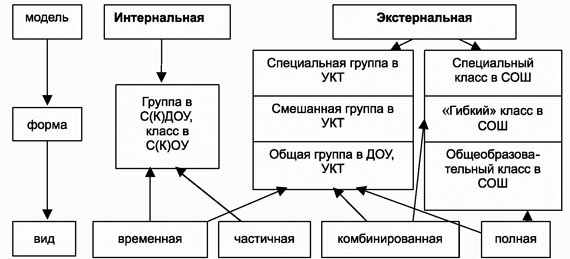 Рис. 1. Формы педагогической интеграции Ведущими сурдопедагогами разрабатываются различные формы пребывания детей в массовых дошкольных учреждениях и школах (И.М. Гилевич, Т.И. Тигранова, 1998; Л.А. Головчиц, Н.М. Назарова, 2000; Э.В. Миронова, Н.Д. Шматко, 2003 - 2005; Л.Е. Шевчук, Э.И. Леонгард, 2006). Определены модели интегрированного обучения, ориентированные на наличие специальных групп при массовых дошкольных учреждениях: временная интеграция, частичная (фрагментарная), комбинированная, полная. Обозначен количественный состав интегрируемых неслышащих детей в составе общеобразовательных групп (классов) - от 12 до 50%, или 1-2 слышащих ребенка в специальной группе (классе) (Э.И. Леонгард, 2006). Определена форма интеграции в виде системы "гибких" классов в структуре общей школы (Л.Е. Шевчук, 2006). Особенностью превентивной (в переводе с англ. - предупредительный, профилактический) интеграции, при которой одинаково сильные группы слышащих детей и детей с нарушением слуха обучаются вместе в специальной школе, является то, что слышащие дети посещают специальное учреждение. Наполняемость класса слышащими и неслышащими детьми равная (H. Breiner, 1989). Т.Л. Лещинская, А.Н. Коноплева (2006) отмечают своеобразие опыта интегрированного обучения детей с нарушениями в развитии Республики Беларусь, где в состав классов интегрированного обучения включаются дети с тяжелыми нарушениями одной нозологической группы или разных нозологических групп, но не более 2 и легкой патологии до 5-6 человек. Л.П. Корвякова, Т.С. Зыкова (2004 - 2006) подчеркивают, что интеграция подростков в образовательную среду слышащих сверстников осуществляется с большим трудом вследствие отсутствия специальных условий обучения (техническое оборудование, звукоусиливающая аппаратура, сурдопереводчик, новейшие технологии и др.) и психологической неготовности педагогических коллективов учреждений. Накоплен опыт социальной и образовательной интеграции в ведущих вузах страны: Новосибирском институте социальной реабилитации при НГТУ, Челябинском государственном университете, Московском государственном техническом университете им. Н.Э. Баумана, в Институте специальной педагогики и психологии Международного университета семьи и ребенка им. Рауля Валленберга, в Санкт-Петербургском государственном университете физической культуры им. П.Ф. Лесгафта. Определяя интеграцию, разные авторы вкладывают в данный термин разные понятия. Возникает необходимость в уточнении значений используемых терминов. Модель интеграции - схема явления, обладающая наиболее общими признаками, т.е такая, в которой осуществляется процесс интеграции - система специального или общего образования. Форма интеграции определяет внешнее содержание явления. За внешнее содержание явления, или видимые характеристики интеграции, принимаем комплектование класса (группы). При интернальной интеграции это обучение в системе специального образования в классе с более легкой формой патологии (неслышащие со слабослышащими, невидящие со слабовидящими). В дошкольном специальном образовании это перевод детей в более сильные группы или группы с легкой патологией. При экстернальной интеграции в системе общего образования - это обучение в специальном классе общеобразовательного учреждения или в общеобразовательном классе (Л.М. Шипицына). В си
