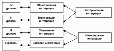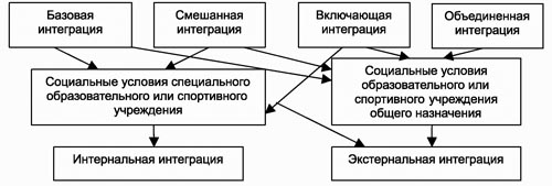 Рис. 2. Структура педагогической и социальной интеграции Модель смешанной интеграции, реализованная в образовательных и спортивных учреждениях, объединяла детей с разницей в возрасте до 3 лет разных нозологических групп (с сенсорными, физическими и интеллектуальными нарушениями) с разным уровнем основного нарушения. Данная модель положительно зарекомендовала себя в интеграции детей с патологией слуха при объединении их с другими нозологическими группами детей, имеющих разную степень нарушений.Педагогической интеграцией неслышащих детей в общеобразовательные школы на уроках физической культуры была реализована модель включающей экстернальной интеграции. В общеобразовательный класс интегрировалось не более 1 ребенка с нарушением слуха и речи.Модель включающей интеграции в процессе исследования была реализована в образовательных и спортивных учреждениях. В нашем случае объединялись неслышащие и слышащие дети школьного возраста в различных формах адаптивного физического воспитания, адаптивной двигательной рекреации и адаптивного оздоровительного спорта. После предварительной подготовки и участия в соревнованиях специальных учреждений по экстернальной модели были организованы физкультурно-оздоровительные группы детей с патологией слуха с постоянным составом занимающихся при городских оздоровительных комплексах, спортивных школах, а также выступления команд в городских оздоровительных соревнованиях среди учащихся общеобразовательных школ. В ходе эксперимента после объявления о наборе в физкультурно-оздоровительную группу желающих заниматься детей с нарушениями в развитии (12 - 15 лет) была апробирована следующая модель экстернальной интеграции. Модель объединенной экстернальной интеграции реализована в физкультурно-оздоровительной группе, где объединялись дети различных нозологических групп и здоровые сверстники для совместных занятий игровыми виды спорта. В ее состав (12 человек) были включены дети с нарушением слуха (6 человек), 3 слышащих ребенка с задержкой психического развития, а также 3 ребенка с легкой степенью нарушения опорно-двигательного аппарата- с незначительным нарушением функции ходьбы. При таком составе (6 неслышащих и 6 слышащих детей) в группе в течение года занятия проводились с учетом индивидуальных возможностей занимающихся.Объединенная и включающая экстернальные модели - это модели III и IV уровней, отвечающие основной цели социальной интеграции включению детей с нарушениями в развитии в социальные отношения со здоровыми сверстниками, адаптации к социальному окружению (рис. 3). Данная структура социальной интеграции позволяет ребенку с нарушением в развитии в соответствии с его индивидуальными психофизическими возможностями освоить доступный уровень социальной интеграции в ходе спортивно-оздоровительных занятий, накапливая опыт социальных взаимоотношений, и перейти к следующему или сразу быть интегрированным в социум здоровых сверстников. Таким образом, в школьном возрастном периоде интегративная функция была реализована в следующих видах АФК: адаптивном физическом воспитании, адаптивной двигательной рекреации, оздоровительном спорте.