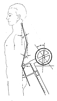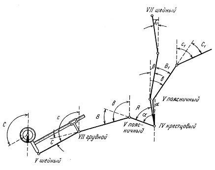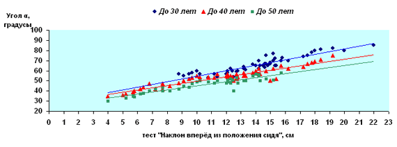 Рис. 1 Методика определения гониометром уровня подвижности позвоночника военнослужащих ВМС ВСУ (тест "наклон вперёд из положения стоя") Оценка методом гониометрии двигательной функции суставов производилась на основании измерения углов основных направлений движения в данном суставе по проекции осей конечности. При стандартной гониометрии позвоночника опорными являются точки, соответствующие концам остистых отростков S4, L4, Th7 и С7 позвонков [2]. В нашем исследовании определялся угол наклона ( α) в поясничном отделе позвоночника (рис. 1). Для определения уровня подвижности позвоночника применялся метрический тест "Наклон вперёд, сидя, см"; "Наклон вперёд, стоя, см.", используемый в практике массовых исследований. Для контроля уровня подвижности плечевого сустава, тест: "движение рук вверх-назад с гимнастической палкой до индивидуального максимума, см". Для контроля уровня подвижности тазобедренного сустава, применялся тест: поперечный "шпагат". Фиксировалась максимальная величина отведения в см. [3,8]. Статистическая обработка результатов тестирования предусматривала: определение валидности теста относительно возрастной группы; разработку рекомендаций для определения уровня подвижности в суставах (гибкости) военнослужащих ВМС ВСУ разных возрастных групп. Обработка данных производилась в среде "Excel 2003", с использованием прикладной программы "Анализ данных", а также программы Statistica 6.0. Рассчитывались показатели вариации, а также коэффициент корреляции (r); коэффициент информативности теста (rtk) [7]. Обсуждение результатов. Коэффициент информативности теста "наклон, вперёд сидя"; "наклон вперёд, стоя", относительно гониометрического измерения, составил в среднем от rtk=0,54 до rtk=0,87 ( р < 0,05) и варьировал в зависимости от возрастной группы военнослужащих ВМС ВСУ. Высокий уровень взаимосвязи позволил рассчитать уравнения регрессии, позволяющие прогнозировать величину наклона в градусах относительно результата метрического теста в сантиметрах. Для примера, на рис. 2, представлены результаты тестирования подвижности позвоночника военнослужащих ВМС ВСУ первой (до 30 лет), третьей (до 40 лет) и шестой (до 50 лет) возрастных групп. Рис. 2 Результаты тестирования подвижности позвоночника у военнослужащих ВМС ВСУ разных возрастных групп. Уравнения регрессии, описывающие установленную зависимость позволяет прогнозировать гониометрическую величину наклона (угол α ), по результатам теста "наклон вперёд из положения сидя", а также иметь информацию об уровне функционального состояния позвоночных структур военнослужащих ВМС ВСУ. Для практического использования нами рассчитаны уравнения регрессии, позволяющие определять уровень подвижности позвоночника (угол α ), по результатам теста "наклон вперёд, из положения сидя, см" для каждой возрастной группы военнослужащих ВМС ВСУ (табл.1). Таблица 1 Уравнения регрессии, позволяющие определить уровень подвижности позвоночных структур (угол α) военнослужащих ВМС ВСУ