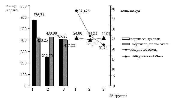 У испытуемых с высоким содержанием инсулина и низким содержанием кортизола отмечалась повышенная активность парасимпатического отдела вегетативной нервной системы. Полученные данные подтверждают известный факт об отражении активности симпатического отдела нервной системы уровнем концентрации кортизола, и отображением активности парасимпатического отдела нервной системы, уровнем концентрации инсулина. Уровень концентрации β-эндорфина является отражением активности регуляторных механизмов работы адаптивных систем организма, наиболее высокий уровень концентрации β-эндорфинов был обнаружен в группах, где показатели концентрации кортизола и инсулина достоверно отличались от средних величин. Таким образом, снижение работоспособности и эффективности соревновательной деятельности у разных спортсменов определялось разными причинами, и при определении составов трав был применен первый принцип индивидуального подбора лекарственных растений. Испытуемые каждой из трех образовавшихся групп были разделены на контрольные и экспериментальные. Экспериментальные группы тренировались с применением индивидуальных средств восстановления работоспособности, в контрольных группах разработанная методика не применялась. Исследование длилось 4 месяца . Лекарственные сборы применялись четырьмя циклами по 21 дню с перерывами по 7 дней. Для спортсменов, у которых преобладала активность симпатического отдела вегетативной нервной системы, было рекомендовано применение средств восстановления работоспособности седативного характера. Для этого применялся лекарственный сбор следующего состава: мята перечная, вероника лекарственная, душица обыкновенная, боярышник кроваво-красный, донник лекарственный, липа сердцевидная, чабрец ползучий, мать-и-мачеха. Для спортсменов, у которых преобладала активность парасимпатического отдела вегетативной нервной системы с признаками истощения адаптивных систем, было рекомендовано применение средств восстановления работоспособности нейтрального или тонизирующего характера. Для этого применялся лекарственный сбор следующего состава: зверобой продырявленный, полынь обыкновенная, Для спортсменов с нормальным вегетативным балансом рекомендовались сборы лекарственных растений нейтрального характера относительно активизации разных отделов вегетативной нервной системы. Учитывались также и индивидуальные предпочтения растений спортсменами согласно составленным описаниям психофизиологических свойств растений. Травяные сборы принимались в виде настоя по 250 мг в сутки. Результаты исследования показали, что разработанная система индивидуализации применения природных средств восстановления спортсменов является модулятором активности адаптивных и регуляторных систем организма, о чем свидетельствует разное изменение показателей концентрации кортизола, инсулина и β-эндорфина в крови у спортсменов контрольных и экспериментальных групп. В первой экспериментальной группе наблюдалось достоверное снижение концентрации кортизола (р<0,001), достоверное повышение концентрации инсулина (р<0,001) и достоверное повышение концентрации β-эндорфина (р<0,05) (рис.2). ![]() Рис. 2. Показатели концентрации кортизола и инсулина в экспериментальных группах до и после проведения эксперимента В перво