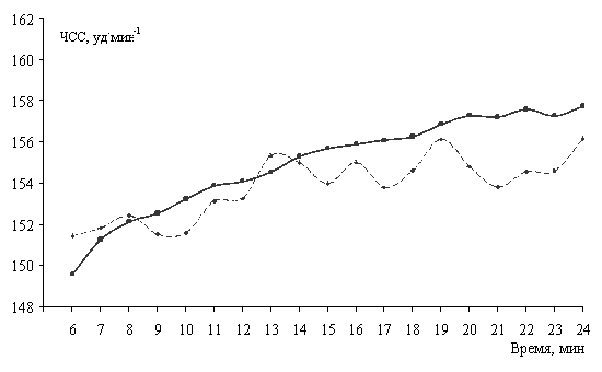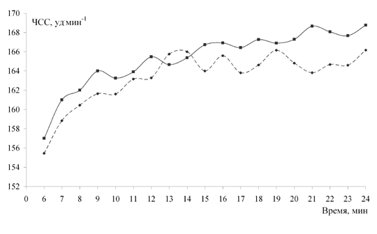 Рис. 1. Индивидуальные данные изменения реакции ЧСС в процессе выполнения контрольного и экспериментального тестового задания с интенсивностью нагрузки 44-49% VO2 max спортсмена Е. Второе контрольное и экспериментальное тестовое задание были выполнены через 42-46 часов после тренировочного занятия с большой нагрузкой. Длительность второго контрольного тестового задания, с интенсивностью работы 55-59% VO2 max была 24 мин, интенсивность равномерная, угол наклона составлял 0°, краткосрочные ускорения отсутствовали. Во втором экспериментальном задании, с интенсивностью работы 55-59% VO2 max, каждые 3 мин были использованы краткосрочные 5 с темповые ускорения. В этом тестовом задании угол наклона беговой дорожки не изменился и был 0°. Длительность упражнения была 24 мин. Результаты тестирования представлены в таблице 2. В таблице видно, что эффект стабилизации (у трех спортсменов) или выраженный линейный характер увеличения функций (у трех спортсменов) был достигнут в период 13-18 мин в процессе выполнения экспериментального задания. При этом отчетливо проявляется усиление реакции вентиляции.