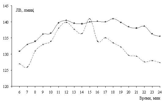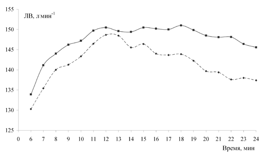 Примечание: * результаты трех лучших и трех худших средних показателей ЧСС за период; ** КТ - контрольное тестирование; ЭТ - экспериментальное тестирование; *** - величина стандартного отклонения от среднего значения На рисунке 1 и 2 схематически представлены индивидуальные данные изменения реакции ЧСС (рис. 1) и реакции легочной вентиляции (рис. 2) в процессе выполнения контрольного и экспериментального тестового задания. Представленные данные являются типичным примером реакции организма квалифицированных спортсменов современном пятиборье на тренировочные упражнения с интенсивностью 44-49% VO2 max в начальной фазе первой стадии восстановления в ударных или соревновательных микроциклах с использованием больших нагрузок.