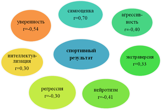 Рис. Значимые корреляционные связи между психологическими особенностями личности и результативностью выступлений квалифицированных легкоатлетов Высокая степень достоверности различий наблюдается между нейротизацией личности и соревновательным результатом. При этом мы наблюдаем отрицательную взаимосвязь, то есть чем ниже нейротизм, тем выше результативность. Что касается влияния психологической защиты на показанный результат, мы имеем две взаимосвязи: между регрессией и результатом - отрицательную, между интеллектуализацией и результатом - положительную. На основе полученных данных, можно заключить, что легкоатлеты, показавшие достаточно высокие результаты, отличаются меньшим уровнем нейротизма, агрессивности и регрессии. При этом они обладают высокой самооценкой и, в стрессовых условиях используют такой защитный механизм как интеллектуализация, что способствует достижению высокого уровня результативности в предстоящих соревнованиях. Выводы.