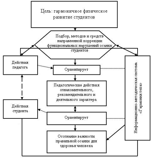 Рис. 1. Модель технологии коррекции нарушений осанки студентов в процессе физического воспитания на основе компьютерных технологий [6] Разработанная технология включает три этапа: мониторинго-информационный, коррекционно-профилактический и поддерживающе-оздоровительный. Составной частью разработанной Н.А. Колосом, [6] технологии является мультимедийная компьютерная информационно методическая система "Гармония тела". Структура комплексной программы коррекции нарушения осанки студенток во фронтальной плоскости с использованием фитболов и физических упражнений восточной гимнастики Тайцзицюань разработана и обоснована в работе Д . В. Эрденко [11]. Ю.И. Ретивых, [10] разработана методика профилактики заболеваний и коррекции ОДА, которая представляется следующими основными взаимосвязанными элементами: 1) формирование костной ткани; 2) воздействие на глубокие мышечные ткани; 3) учет биомеханики внутренних органов; 4) создание условий для эффективной деятельности функциональной системы, ответственной за адаптацию к физическим нагрузкам. Методика профилактики заболеваний и коррекции нарушений ОДА представляется как комплекс взаимосвязанных и последовательно выполняемых упражнений физической и психической направленности тренировки, которая реализовывалась в три этапа: