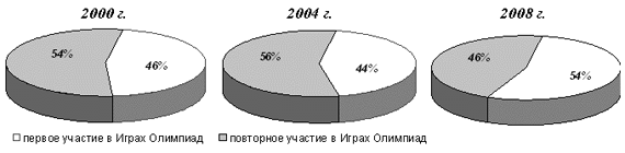 Рис. 1. Соотношение эффективности выступления пловцов Украины на Играх Олимпиад 2000 - 2008 г.г. Это во многом обусловливает повышенное внимание к данной проблеме. Необходимо заметить, что в специальной литературе, в том числе и по спортивному плаванию, данная проблема имеет довольно широкое обсуждение. Теоретико-методические основы предсоревновательной подготовки в спорте были всесторонне рассмотрены и обоснованы в разные периоды профессором В.Н. Платоновым [5, 6], а также известными зарубежными специалистами Дж. Каунсилменом [3, 4], С.М.Вайцеховским [1]. Работа выполнена по плану НИР Национального университета физического воспитания и спорта Украины. Цель, задачи работы, материал и методы. С целью повышения эффективности практической работы нам представляется необходимым выделить основные теоретико-методические положения предсоревновательной подготовки спортсменов высокого класса. Методы исследования. Исследования основывались на анализе специальной литературы и документов, характеризующих процесс подготовки и соревновательную практику квалифицированных спортсменов в 4-х летних олимпийских циклах. Результаты исследования и их обсуждение. Прежде всего, необходимо сказать, что в практике спорта под термином "сужение" понимает период разного снижения и изменения направленности нагрузки перед главными соревнованиями с целью полного восстановление организма спортсмена и достижения состояния готовности к стартам в соревнованиях. Продолжительность периода "сужения" вариативна и зависит от многих факторов, но прежде все го от характера и продолжительности предшествующей подготовки пловца. В мировой практике существуют различные варианты и схемы предсоревновательной подготовки, остановимся на 2-х из них, на наш взгляд наиболее эффективных. Продолжительность этапа непосредственной подготовки к главным соревнованиям года колеблется в пределах 5-8 недель (в зависимости от периода между отборочными соревнование главными - чемпионатом Европы, мира, Олимпийских игр) и обычно состоит из 2 мезоциклов. Первый из них - направлен на развитие качеств и способностей определяющих уровень спортивных достижений в конкретной соревновательной дисциплине и в целом имеет большую суммарную нагрузку. Другой - предусматривает - полное восстановление, обеспечение условий для эффективного протекания адаптационных процессов с учетом соревнований и специализации спортсмена. Общая структура этапа непосредственной подготовки к основным соревнованиям сезона состоит из: 1) активного отдыха после отборочных соревнований (как правило, чемпионата страны) - 4-5 дней. Этот непродолжительный период посвящается, прежде всего, психологическому и физическому восстановлению после прошедших. 2) базового мезоцикла, продолжительностью 3-4 недели, который обычно состоит из 2 частей: общеподготовительной и специально-подготовительной. Характерным отличием первой части является то, что объем работы, выполняемый в течение дня, превышает уровень предыдущих параметров тренировочной работы и в целом охватывает до 5-7 часов. Вторая часть мезоцикла носит специализированный характер, где главной задачей является сильное специфическое воздействие на организм спортсмена . При этом объем работы резко сокращается - до 3-4 часов в день, а интенсивность возрастает. С