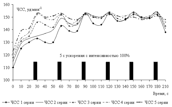 У двух спортсменов заданная реакция отмечена при выполнении только четырех серий. Этот тип реакции также можно считать адекватным, который отражает норму реакции организма в этот период подготовки, индивидуальные возможности спортсменов, текущее состояние восстановительных процессов в организме. По реакции организма на нагрузку, ее воздействие по величине может считаться средним. В этой связи эффект нагрузки может быть зарегистрирован на следующее утро в стандартных условиях измерений, представленных выше. Оценка представленных в таблице данных дает основании говорить, что параметры нагрузки могут быть модифицированы с учетом типологических особенностей реагирования организма на 5 с ускорения. Это связано с количеством ускорений в серии работы. Количество ускорений в серии может варьироваться в зависимости от индивидуального типа реактивности и текущего состояния спортсмена. Главное должно быть соблюдено условие нагрузки, которое обеспечивает полноценное нейрогенное стимулирование функций организма. Обеспечение условий, при которых быстро достигается и поддерживается максимальный прирост ЧСС в ответ на 5с темповые ускорения. Это могут быть варианты нагрузки, когда в серии пропорционально снижается или увеличивается количество ускорений. Например, количество ускорений в первой серии - 8, во второй - 7, в третьей - 6, четвертой -5, пятой - 4. Соответственно увеличивается или снижается длительность серии. Могут быть другие варианты в зависимости от индивидуальной реактивности спортсменов. На рисунке 1 схематически, на примере спортсмена Е. представлен оптимальный вариант реакции организма на нагрузку. На рисунке 1 видно, что в процессе выполнения всех серий спортсмен достиг заданных параметров прироста функций. Снижение прироста ЧСС в ответ на последнее ускорение 5 серии, говорит о реализации нейрогенного стимула и начале доминирования других стимулирующих факторов. Результаты экспериментальной проверки реакции организма на экспериментальную нагрузку показали более высокий уровень реакции ЧСС на стандартную и переменную тестовую нагрузку по сравнению с контрольными измерениями (см. табл. 2). В условиях стандартной равномерной работы были зарегистрированы более высокие уровни устойчивости реакции ЧСС. В процессе выполнения стандартных ускорений были достигнуты более высокие пиковые уровни ЧСС и более высокие показатели устойчивости прироста ЧСС в ответ на 5 с темповые ускорения. Усиление кинетики функций организма в ответ на стандартные тестовые нагрузки позволяет говорить о более высоких реактивных свойствах КРС через 22 часа после экспериментальной тренировки по сравнению с аналогичными контрольными измерениями. ![]() Рис.1. Изменения ЧСС в ответ на 5 с ускорения с интенсивностью 100% в процессе выполнения пяти серий переменной работы Таблица 2 Показатели реакции ЧСС в период контрольного (КТ) и экспериментального (ЭТ) тестирования квалифицированных спортсменов в современном пятиборье через 22 часа после тренировочного занятия, направленного на реализацию нейрогенного стимула реакций