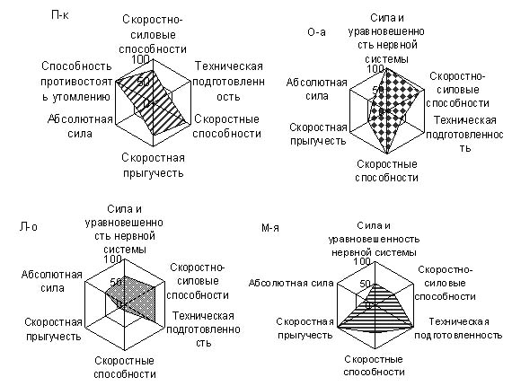 В пятый фактор вошли такие показатели, как ЧСС на первой и второй минутах восстановления после челночного бега с положительным коэффициентом корреляции, скоростная прыгучесть также с положительным коэффициентом корреляции. Скоростная прыгучесть является специфическим качеством для баскетболистов, и ее сочетание с замедленным восстановлением показывает, что способность быстро совершать серийные прыжки больше отражает скоростные качества, которые обратно пропорциональны уровню развития выносливости и способности к восстановлению. Поэтому пятый фактор был назван "Скоростная прыгучесть" (табл. 1, рис. 1). В шестой фактор вошли показатели массы тела и результата в метании набивного мяча с места. Поэтому он был назван "Абсолютная сила" (табл. 1, рис. 1). Седьмой фактор, согласно показателям, которые в него вошли, был назван "Способность противостоять утомлению" (табл. 1, рис. 1). Была также определена индивидуальная факторная структура подготовленности баскетболисток (табл. 2, рис. 2). Тем спортсменкам, у которых были выявлены высокие значения второго фактора (табл. 2, рис. 2), были даны специальные рекомендации по развитию скоростно-силовых качеств. Таблица 2 Индивидуальные значения факторов (в %) подготовленности баскетболисток студенческой команды (n=12)