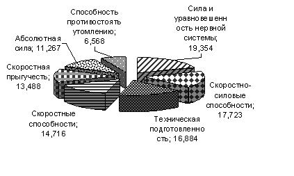 Рис. 1. Процент от общей дисперсии главных факторов в структуре подготовленности баскетболисток студенческой команды (n=12) Показатель ЧСС на 3-й минуте восстановления вошел во второй фактор с положительным коэффициентом взаимосвязи, что свидетельствует о замедленном восстановлении. Замедленное восстановление также свидетельствует о недостаточном развитии выносливости в отличие от высокого развития скоростно-силовых способностей. Показатель ошибки "укорочения" воспроизводимого интервала 24с вошел во второй фактор с положительным коэффициентов корреляции, а показатель ошибки "удлинения" временного интервала 24с вошел во второй фактор с отрицательным коэффициентом корреляции, что свидетельствует об отражении во втором факторе тенденции к "укорочению" временных интервалов при их восприятии. Это свидетельствует о преобладании процессов возбуждения над процессами торможения в нервной системе, что сопряжено с развитием скоростно-силовых способностей. Поэтому второй фактор и был назван "Скоростно-силовые способности" "" (табл. 1, рис. 1). В третий фактор вошли показатели точности средних и штрафных бросков, время защитных перемещений, время выполнения теста "скоростная техника", длительность овариально-менструального цикла, время челночного бега, стаж занятий баскетболом. Следует отметить, что показатели специальной выносливости (челночный бег) и техническая подготовленность в данном исследовании имеют противоположные коэффициенты корреляции, которая может быть объяснена тем, что наиболее технические игроки не всегда самые быстрые. Но стаж занятий баскетболом, который вошел в данный фактор, свидетельствует о большем влиянии стажа занятий баскетболом на техническую подготовленность, чем на специальную выносливость. Таким образом, третий фактор был назван "Техническая подготовленность" (табл. 1, рис. 1). В четвертый фактор вошли такие показатели, как точность воспроизведения временного интервала 8с, время пробегания отрезка 2*28м и длина тела с отрицательным коэффициентом корреляции. Данные показатели характеризуют уровень развития скоростных способностей и отражают специальные качества защитников, т.е. спортсменов относительно невысокого роста, для которых характерен высокий уровень развития скоростных способностей и точность воспроизведения временного интервала 8 с. Поэтому четвертый фактор был назван "Скоростные способности" (табл. 1, рис. 1). Таблица 1 Факторная структура подготовленности баскетболисток студенческой команды (n=12)