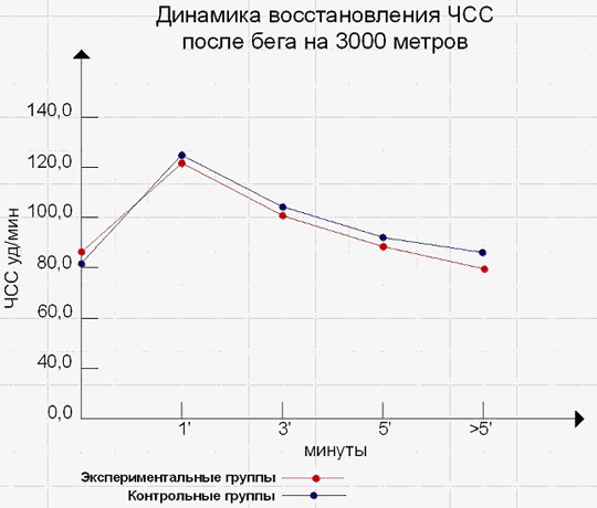 В конце периода восстановления показатели ЧСС в каждой из экспериментальных групп лучше, чем в контрольных группах и колеблются в пределах (1,1-4,9 уд./мин.) (таблица 1,2), а средний показатель восстановления ЧСС 80,7 уд./мин. и, соответственно, 84,6 уд./мин. (таблица 3). Таблица 3 Показатели ЧСС в период восстановления после бега на 3 000 метров