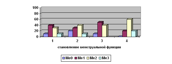 Результаты динамометрии в экспериментальной группе достоверно увеличились в восстановительно-поддерживающих мезоциклах и базовом (февраль-март) по отношению к втягивающему, а также в период между базовыми мезоциклами (p<0,05-0,01). Показатели теста PWC 170 в процессе улучшались. Достоверные изменения произошли в период тренировочного процесса от восстановительно-поддерживающего (апрель) до базового и восстановительно-поддерживающего мезоцикла (p<0,05), а также базового к базовому и втягивающему мезоциклам (p<0,05-0,01).На протяжении тренировочного процесса показатель МПК в экспериментальной группе постепенно увеличивался и достоверные изменения выявлены в восстановительно-поддерживающем (апрель) по отношению к втягивающему и восстановительно-поддерживающему (январь) (p<0,05-0,001) (табл.2.). Показатели тестов функционального состояния юных велосипедисток 12-13 лет в контрольной и экспериментальной группах в начале эксперимента достоверно не отличались (табл.1,2), однако на протяжении шести месяцев тренировочного процесса в контрольной группе выявлены изменения в показателях АД, PWC170, МПК (p<0,05), тогда как в экспериментальной группе значительных изменений выявлено не было (p>0,05). Определение воздействия тренировочных нагрузок на становление овариально-менструальной функции выявило, что в начале эксперимента в контрольной группе у 10 % девушек начались регулярные менструации, при этом у 40 % наблюдались 1-2 менструации (менархе), а у 30 % юных велосипедисток менструация проходила нерегулярно и у 20 % девушек она отсутствовала (рис 2.). В экспериментальной группе на начало подготовительного периода нерегулярные менструации прослеживались у 40% велосипедисток, а у 20 % менструация отсутствовала. Наблюдалось 1-2 менструации у 30% юных велосипедисток, где менструация началась у 10 % девушек. 1-до эксперимента (контрольная группа) 2-до эксперимента (экспериментальная группа) 3-после эксперимента (контрольная группа) 4-после эксперимента (экспериментальная группа) Рис.2. Становление менструальной функции юных велосипедисток 12-13 лет в контрольной и экспериментальной группе После окончания подготовительного периода в экспериментальной группе начались регулярные менструации у 20 % девушек тренировочный процесс которых проводился по разработанной нами методике, при этом в контрольной группе, которая осуществляла тренировочный процесс по общепринятой методике регулярные менструации не наблюдались. Нерегулярные менструации прослеживались у 40 % девушек контрольной группы, тогда как в экспериментальной группе за период эксперимента наблюдалось менструация у 60 % девушек. Менархе и 1-2 менструации в экспериментальной группе прослеживались у всех девушек, при этом в контрольной группе отсутствие менструации наблюдалось у 10 % велосипедисток (рис.1.). Таким образом, различное построение тренировочного процесса не одинаково влияет на становления репродуктивной функции, в контрольной группе он способствовал задержке в половом развитии. Более эффективным в становлении менструальной функции девушек является разработанная нами методика построения тренировочного процесса.(рис.1). Выводы 1. Построение мезоциклов юных велосипедисток 12-13 лет в контрольной группе без учета становления репродуктивной функции способствовало изменению артериального давления. Значитель