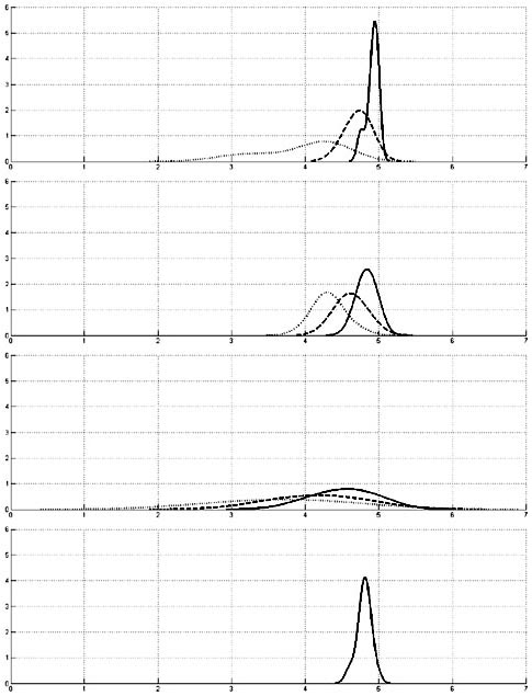 ................... исходные данные (до занятий) _ _ _ _ _ _ _ промежуточные данные (через 2 года) __________ конечные данные (через 4 года занятий)Рис. 1. Изменение показателей технической подготовки у спортсменов трех групп применяемых акробатическую подготовку на этапе специализированной базовой подготовки в черлидинге Анализ данных по ТП показал наличие наиболее упорядоченного пика, т.е. более высокий по амплитуде к концу 4-го года занятий в 1-ой экспериментальной группе черлидеров, что свидетельствует об однородности показателей практически приближенной к модели эксперимента. Можно заметить сильное увеличение коэффициента асимметрии при сравнении начальных и конечных значений первой группы. К концу 4-го года занятий во второй группе черлидеров диапазон значений лежит от 4,1 до 5,1 баллов, пик функции приближен к 4,5 баллам и во временном интервале происходит сдвиг вправо, что говорит о незначительном улучшении результатов. Интервал значений по ТП у черлидеров 3-ей группы через четыре года занятий довольно широкий от 3 до 5,5 баллов и можно наблюдать плоские функции распределения, что свидетельствует о низких результатах. Выводы. Акробатическая подготовка должна прочно войти в учебно-тренировочный процесс черлидеров не только как одно из основных средств совершенствования физических качеств, но и как средство повышения спортивного мастерства в соревновательной программе черлидинга, спортсмены выполняют следующие акробатические элементы: прыжки, вращения, махи, перевороты, мосты, кувырки, а так же удержание равновесия и элементы на гибкость. Несмотря на частое использование элементов акробатики во время соревновательных программ у черлидеров, акробатическая подготовка остается средством специально-двигательной деятельности спортсменов. Результаты исследования, на наш взгляд, позволят тренеру индивидуализировать тренировочный процесс, более целенаправленно управлять специальной деятельностью, а также, позволят повысить эффективность всей системы подготовки, стабильно демонстрировать высокие результаты на главных соревнованиях и целенаправленно воспитывать полноценный резерв для сборных команд различного уровня. Дальнейшее исследование предполагается провести в направлении оптимизации тренировочного процесса в черлидинге на этапе специализированной базовой подготовки. Список литературы. 1. Болобан В.Н. Спортивная акробатика. / В.Н. Болобан. - К.: Вища шк. Головне изд-во, 1988 - 168 с. 2. Боляк А.А. Правила змагань. / А.А. Боляк, Ю.Ю. Крикун, I.М. Аукштiкальст. - Киiв, 2005. - 82с. 3. Крикун Ю.Ю. Особенности развития черлидинг как вида спорта в Украине / Ю. Ю. Крикун // Фiзичне виховання рiзних верств населення. - 2007, № 7 - С. 39 - 41. 4. Луценко Л.С. Акробатическая подготовка в рок-н-ролле / Л.С. Луценко // Педагогiка, психологiя та медико-бiологiчнi проблеми фiзичного виховання i спорту. - Харкiв, 1999, № 18 . - С. 49-53. 5. Методические рекомендации по формированию специфических индивидуальных качеств "cheerleaders"-групп поддержки спортивных команд. Метод. пос. для педагогов-инструкторов и тренеров / сост. С.А.Носкова. - М.: МГСА, 2001 6. Платонов В.Н. Общая теория подготовки спортсменов в олимпийском спорте / В. Н. Платонов. - Киев : Олимпийская литература, 2004. - 808 с. 7. Сергiенко Л.П. Тестування рухових здiбностей школярiв / Л. П. Сергiенко. - Миколаiв : УДМТУ, 2001. - 440 с. 8. Смолевский В.М. Спортивна