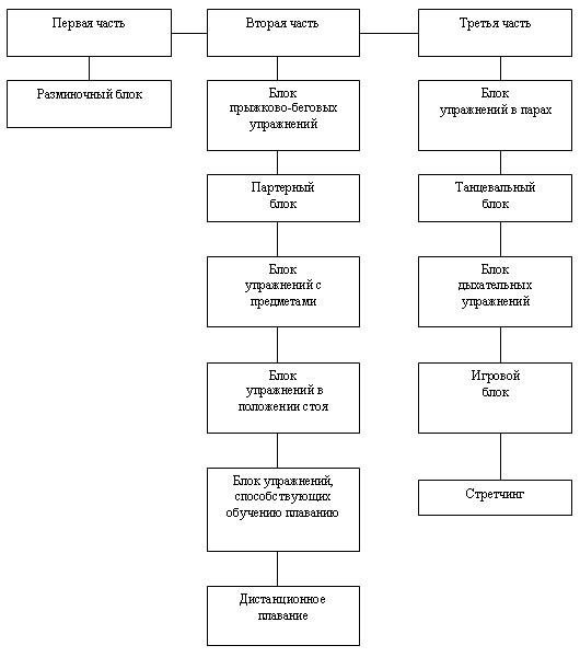 Рис. 1. Схема занятий аквааэробикой в учебно-тренировочном процессе ДЮСШ При организации занятий нами применялся индивидуально-групповой метод. Занятия строились с учетом основных принципов: повторности, постепенности и индивидуализации. Учитывая индивидуальные возможности боулера - формировались группы с низким, ниже среднего, средним, выше среднего, высоким уровнем физического состояния (УФС) (табл.1). Таблица 1 Примерная схема тренировочных программ для занимающихся с разным уровнем физического состояния