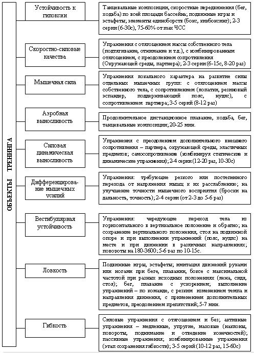 Рис. 2. Примерный перечень упражнений аквааэробики В процессе физической подготовки боулера метод упражнения использовался во всех вариантах: повторный, переменный, интервальный, соревновательный и применялись методические приемы: • при выполнении силовых упражнений движения выполняются против направления действия силы тяжести, скорость движения незначительная, количество повторений небольшое; • при скоростных упражнениях масса перемещаемых частей тела уменьшается (сокращается амплитуда движений); • при выполнении упражнений на выносливость интенсивность усилий, скорость и темп движений снижены, используются уже изученные, без резких и неожиданных изменений условий работы мышц. В связи с этим, мы считаем, что регулярное, многократное выполнение специально развивающих упражнений в течение относительно длительного периода времени с постепенным повышением требований к работе двигательного аппарата и организма в целом должно привести к таким анатомо-физиологическим изменениям в организме, которые обеспечат лучшее проявление соответствующих двигательных качеств. В то же время, необходимо проводить проверку уровня развития двигательных качеств боулера. Используя специальные контрольные упражнения. Контрольным упражнением может быть только такое упражнение, которое позволяет проявить проверяемое качество в полной мере (табл.2). Таблица 2 Двигательные качества и методика их развития