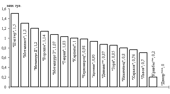 Диаграмма 2. Структура прибыли команды Национальной футбольной лиги США [2] В Украине профессиональный футбол имеет свои особенности, если в европейских клубах коммерческо-спортивного типа предпринимательства основные поступления прибыли - продажа прав на телетрансляцию и продажу билетов и абонементов, то у украинских - поступление от продажи игроков, спонсорские взносы, реклама. За последние годы ситуация с продажей прав на телетрансляцию носит все более централизованный характер. В сезоне 2008-2009 15 футбольных клубов (ФК) Премьер-лиги (за исключением ФК "Днепр", который реализовал свои теле- и рекламные права самостоятельно) получили прибыль на 14.5 млн. гривен, но это формально, а практически - полную сумму прибыли не получил ни один клуб. На диаграмме 3 приведено динамику прибыли всех клубов Премьер-лиги. Для сравнения: за 2008 год 53 европейских ФК топ-дивизиона заработали 4.1 млрд. евро от продажи прав на телетрансляцию. [3]