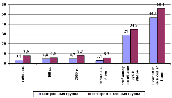 Как видно из таблицы 2, исходная средняя величина теста на гибкость составила 7,27± 1,09; бега на 100 м. составила 18,12± 0,29; бега на 2000 м. составила - 16,12± 0,51; челночного бега составила - 11,63± 0,25; поднимания в сед составила - 19,6± 1,81; сгибания/разгибания рук в упоре лежа на полу составила - 6,2± 1,53. К концу семестра зарегистрированы следующие показатели: отмечалась тенденция к увеличению гибкости, которая составила 7,53± 0,89; скорость бега на 100 м. достоверно увеличилась и составила 17,25± 0,27; отмечена тенденция увеличения скорости бега на 2000 м и этот показатель составил - 15,35± 0,44; челночный бег увеличился и составил - 11,27± 0,23; поднимание в сед достоверно увеличился и составил 27,6± 1,84; сгибания/разгибания рук в упоре лежа на полу достоверно увеличился и составил 11,6± 1,43. Как видно из приведенных материалов в начале семестра у обследованных студенток экспериментальной и контрольной групп были зарегистрированы достаточно неблагоприятные величины практически всех использованных в исследовании показателей. К концу семестра у студенток обеих групп отмечено улучшение таких физических качеств как, скорость, ловкость, выносливость, сила. Однако стоит отметить, что наиболее выраженные статистически значимые изменения показателей были отмечены в конце семестра у студенток экспериментальной группы. Рис.1. Величины относительного прироста значений изученных показателей физического развития студенток 1 курса экспериментальной и контрольной групп (в % к величинам данных показателей, зарегистрированных в начале семестра) Достаточно убедительными выглядели также результаты анализа величин относительного прироста изменений использованных контрольных нормативов. Так, у студенток экспериментальной группы увеличение гибкости составило 7,9%, скорости бега на 100 м - 5,9%; скорости бега на 2000 м.- 8,3%; челночного бега - 5,7%; сгибание/разгибание рук в упоре - 34,9%; поднимание в сед за 1 мин.- 56,1%. У студенток контрольной группы увеличение гибкости составило 3,5%; скорости бега на 100 м. 4,8%; скорости бега на 2000 м.- 4,7%; челночного бега - 3,1%; сгибание/разгибание рук в упоре - 29%; поднимание в сед за 1 мин.- 46,6%. Выводы Для увеличения двигательной активности студенток ВУЗа целесообразно применять на занятиях по физическому воспитанию подвижные игры, которые являются средством развития таких физических качеств как сила, скорость, гибкость, выносливость, ловкость. Подвижные игры также компенсируют дефицит двигательной активности, способствуют улучшению психологического состояния занимающегося, формируют стремление к систематическим занятиям физической культурой, являются пропагандой здорового образа жизни. Безусловно, внедрение национальных подвижных игр Армении в занятия по физическому воспитанию в ВУЗах будет способствовать повышению общей физической подготовленности и состояния здоровья в целом. Актуальными на сегодня являются дальнейшие исследования, связанные с разработкой программы по физическому воспитанию студентов в ВУЗах с учетом интересов. Несомненно важными является также изучение проблем воспитания потребностей и мотивов к занятиям физическими упражнениями. Все указанные вопросы являются предметом дальнейших исследований. Литература 1. Жуков М.Н. Подвижные игры: Учеб. для студ. пед. вузов. / М.Н. Жуков. - М.: Издательский центр "Академия", 2002. - 160 с. 2. Здоровье студен