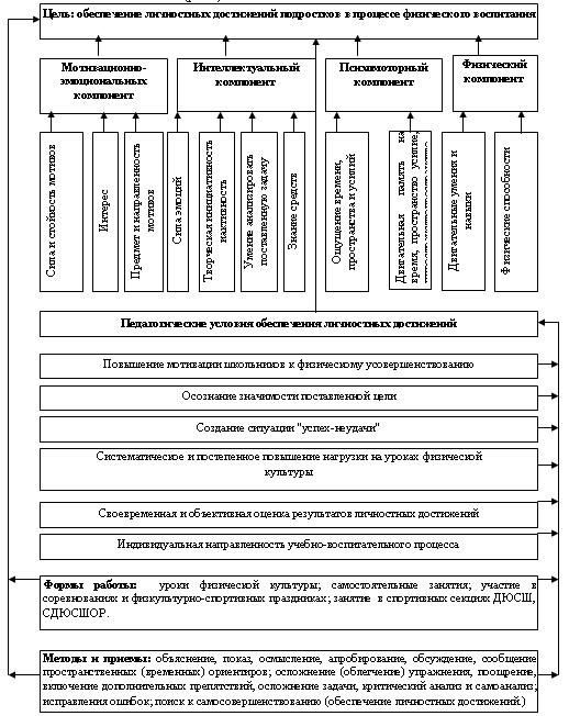 Рис.1 Модель обеспечения личностных достижений подростков в процессе физического воспитания. Проведенный анализ результатов педагогического наблюдения, анкетирования и констатирующего эксперимента удостоверил, что большинство школьников удовлетворены результатами своей учебной деятельности по физическому воспитанию. Вместе из тем, процент утвердительных ответов у школьников разных классов неодинаковый. С 5-го по 7-й класс значительно увеличивается количество школьников (на 9,2%), которые отрицательно относятся к совершенствованию личностных достижений средствами физической культуры. Также уменьшилась на 8,9% количество подростков, которые удовлетворены своей деятельностью на уроках физического воспитания. По результатам констатирующего эксперимента подростки экспериментальных и контрольных классов были разделены на три условных группы: с высоким, средним и низким уровнями личностных достижений. Высокий уровень характеризуется: ответственным отношением к учебно-воспитательному процессу, стойким интересом и мотивом, потребностью совершенствования личностных достижений с использованием их в будущем, положительными эмоциями от учебно-физкультурной деятельности, пониманием влияния занятий физической культурой и спортом на здоровье; творческим подходом к выполнению поставленных задач; поиском эффективных путей самосовершенствования, знанием средств для успешного выполнения поставленных задач; высоким уровнем психомоторных компонентов и показателей физической подготовленности (10-12 баллов). Средний уровень характеризуется: положительно-пассивным отношением к усовершенствованию личностных достижений, стойким интересом и мотивами только к тем задачам, которые не требуют значительных усилий как физических, так и интеллектуальных (в основе силы эмоций лежит оценка учителя); пониманием влияния занятий физической культурой и спортом на здоровье, но нежеланием совершенствоваться самостоятельно; слабым желанием проявлять творческую инициативу и анализировать ситуации, которые возникают при выполнении поставленных задач, средним уровнем проявления психомоторных компонентов и показателей физической подготовленности (7-9 баллов). Низкий уровень характеризуется: отсутствием интереса и мотивов к учебно-физкультурной деятельности, низким уровнем личностных достижений, которые вызывают отрицательные эмоции при выполнении физических упражнений; отсутствием систематизированных знаний, непониманием влияния занятий физической культурой и спортом на здоровье; недостаточным представлением их значения в последующей жизнедеятельности человека; отсутствием творческой инициативы и активного поиска при выполнении поставленных задач; низким уровнем проявления психомоторных компонентов и показателей физической подготовленности (6 баллов и меньше). Разработанная нами методика предусматривала три этапа усовершенствования личностных достижений школьников. На первом этапе подростки учились сознательно воспроизводить свои движения во времени, пространстве, по усилиям. Выполнение таких задач требовало проявления мотивационно-эмоциональных и интеллектуальных компонентов, психомоторных способностей, и соответствующего уровня физической подготовки. Также одним из главных задач первого этапа было форми