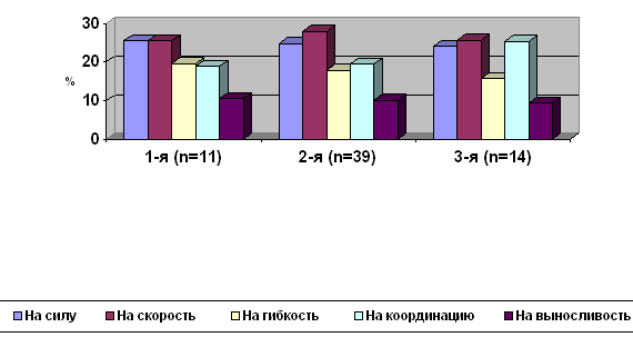 В соревновательном мезоцикле разница между скоростными упражнениями в первой группе составила 3,4 и 21,9 %, во второй - 4,2 и 26,8 %, третьей - 3,8 и 19,8 %; между скоростно - силовыми упражнениями соответственно- 5,2 и 24,0 %, 8,0 и 24,5 %, 3,2 и 23,1 %; силовыми- 8,6 и 6,8 %, 3,8 и 2,3 %, 7,0 и 3,3 %. Ниже приведено соотношение средств ОФП и СФП у тяжелоатлетов - ветеранов Украины различных групп весовых категорий (рис.4). Рис.4. Соотношение средств ОФП и СФП (%) у тяжелоатлетов-ветеранов Украины разных групп весовых категорий. Анализ показывает, что разница между III-й и I-й группами упражнений средств ОФП составляет - 6,8 %, III-й и II-й - 2,1 %; II-й и I-й - 2,7 %. Выводы 1. В теории и практике подготовки тяжелоатлетов-ветеранов - еще недостаточно полно изучено содержание тренировочной работы в подготовительных и соревновательных мезоциклах. 2. Рассмотрено содержание тренировочной работы тяжелоатлетов- ветеранов различных групп весовых категорий, готовящихся к чемпионату мира и Европы среди ветеранов. 3. Проведена сравнительная характеристика распределения упражнений по характеру работы в подготовительных и соревновательных мезоциклах тяжелоатлетов-ветеранов и высококвалифицированных тяжелоатлетов. В подготовительном мезоцикле у тяжелоатлетов - ветеранов имеется тенденция увеличения скоростных и силовых упражнений с повышением групп весовых категорий - на 8,2 и 1,4 %, а в соревновательном - в скоростно-силовых - на 4,4 %. 4. Анализ распределения объема нагрузки по группам упражнений у сильнейших тяжелоатлетов- ветеранов показывает, что 51,6 % участников больше всего тренируются в зоне интенсивности 80 - 89 %; 37,5 % - соответственно - 70 - 79 %; 7,8 % - 60 - 69 % и 3,1 % - 90 - 99 %. Дальнейшие исследования предполагается провести в направлении изучения других проблем подготовки тяжелоатлетов с учетом групп весовых категорий. Литература 1. Алаев П.Т. Актуальные проблемы подготовки сборной команды Украины по тяжелой атлетике к Олимпийским играм 2000 года. Учебно - методические рекомендации./ П.Т. Алаев, В.Г. Олешко, В.И. Цимиданов. - К.: Федерация тяжелой атлетики Украины, 2000.- 36с. 2. Дворкин Л.С. Тяжелая атлетика: [учебник для вузов] / Л.С. Дворкин. - М.: Советский спорт, 2005.- 600с. 3. Медведев А.С. Система многолетней тренировки в тяжелой атлетике: [учебное пособие для тренеров] / А.С. Медведев - М.: Физкультура и спорт, 1986.- 272с. 4. Медведев А.С. Совершенствование методики тренировки в тяжелоатлетическом спорте на основе приоритетного применения дополнительных упражнений на этапе становления спортивного мастерства. / А.С. Медведев // Теория и практика физической культуры.- 2000.-№ 11. - С. 30- 37. 5. Олешко В.Г. Силовi види спорту. / В.Г. Олешко. - К.: Олiмпiйська лiтература, 1999.- 288с. 6. Олешко В.Г. Особенности построения тренировочных программ юных квалифицированных тяжелоатлетов. / В.Г. Олешко, Ю.А. Лутовинов // Педагогiка, психологiя та медико-бiологiчнi проблеми фiзичного виховання i спорту: Зб. наук. пр. за ред. Ермакова С.С.- Харкiв: ХДАДМ(ХХПI), 2006.- № 5.- С.62 - 68. 7. Олешко В.Г. Тенденции физического развития тяжелоатлетов - ветеранов. / В.Г. Олешко, Ю.А. Лутовинов, К.В. Ткаченко, В.Н. Лысенко // Педагогiка, психологiя та медико-бiологiчнi проблеми фiзичного виховання i спорту: Зб. наук. пр. за ред. Ермакова С.С.- Харкiв: ХДАДМ(ХХПI), 2008.- № 8.- С. 111 - 114. 8. Олешко В.Г. Особливостi побудови тренувальноi роботи важкоатлетiв високоi квалiфiкацii у рiчному макроциклi / В.Г. Олешко // Теорiя i методика 