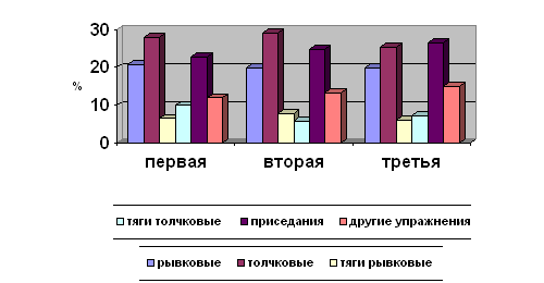 Примечание: в числителе - показатели подготовительного мезоцикла; в знаменателе - соревновательного мезоцикла. Анализ показывает, что разница между упражнениями скоростного характера в I-й группе весовых категорий в подготовительном мезоцикле составила 12,2 и 18,2 %, во II-й - 0,3 и 25,0 % и III-й - 0,7 и 28,8 %; между скоростно - силовыми упражнениями соответственно - 3,5 и 20,9 %, 10,5 и 28,5 %, 11,9 и 36,1 %; силовыми - 8,7 и 5,4 %, 10,0 и 3,5 %, 11,2 и 7,3 %. Таблица 2 Распределение упражнений по характеру работы в подготовительных и соревновательных мезоциклах (%) у мастеров спорта разных групп весовых категорий (А.Н. Воробьев, 1988)